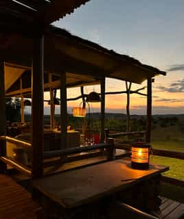 At the centre of the camp, there is a dining and lounge area where you can enjoy time spent swapping stories with the other guests. Natural wood accents and earthy tones create a serene setting, perfect for relaxing after a day in the bush. An open deck invites you to dine under the stars or enjoy a morning cup of coffee while watching wildlife traverse the landscape. A fire pit nearby sets the scene for storytelling under starry skies.