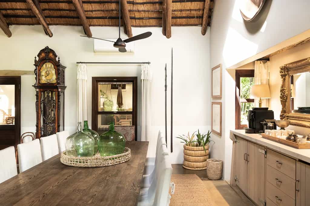 The main house features a series of places to relax—whether it be by the fire, surrounded by books or enjoying a sophisticated dinner. Other rooms to explore and enjoy are the wine cellar, small gym, and spa treatment room. Outside, guests can relax by the pool, challenge each other to a game of tennis, or wander around the manicured gardens. The kitchen still retains its country style while an African flair is found around the boma.