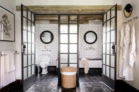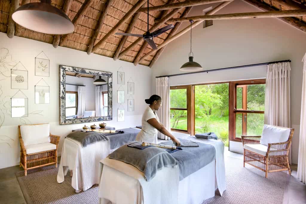 Six individual cottages are scattered around the grounds. Only 12 people can stay here in total at any given time. The cottages allow for privacy whenever guests feel like it. Each cottage overlooks the waterhole. Designers have done away with the traditional decor of safari lodges and created something more cosy - something you would find at a farm stay. Chic French doors open up into a bathroom with his and her sinks and a claw-footed bath.