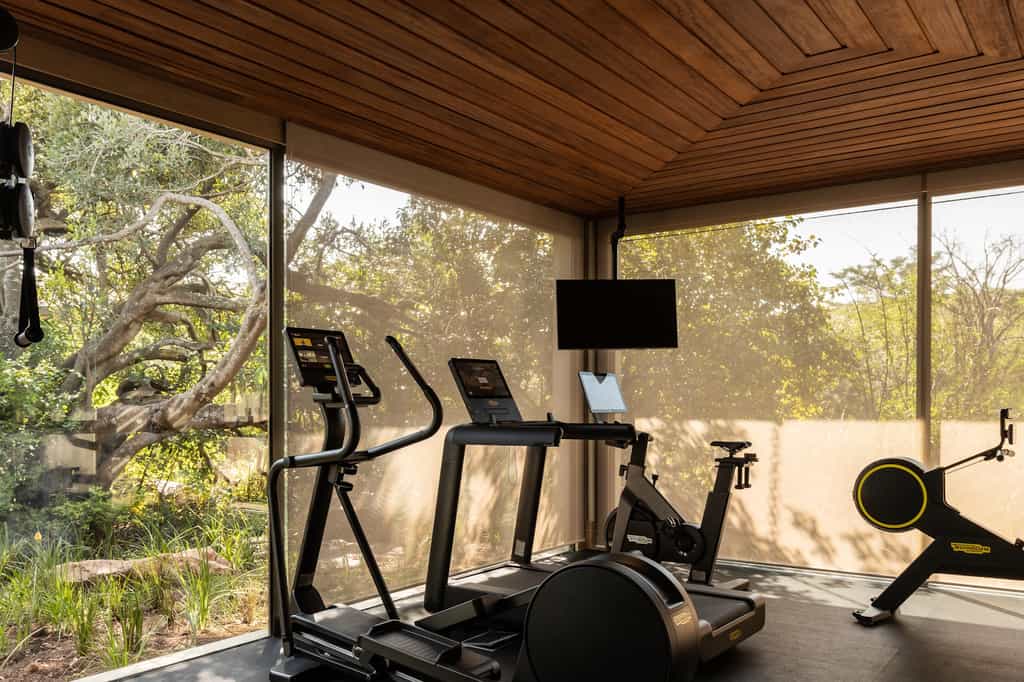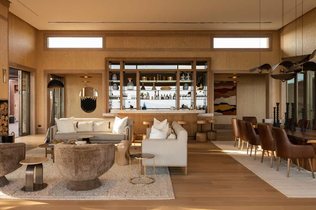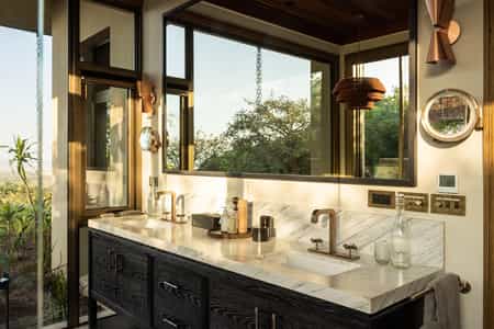 Milele has a collection of fantastic spaces to swap stories with friends and family, all the while soaking up the spectacular views. A dedicated chef is ready and waiting to prepare tailored menus and there's a well-stocked cellar of global wines to accompany meals. There's also an outdoor yoga and wellness sala, a fitness centre, and an infinity pool with an adjacent hot tub. Throughout, the style is natural with calming, sandy tones and beautiful wooden details like the tree-trunk columns on the main deck.