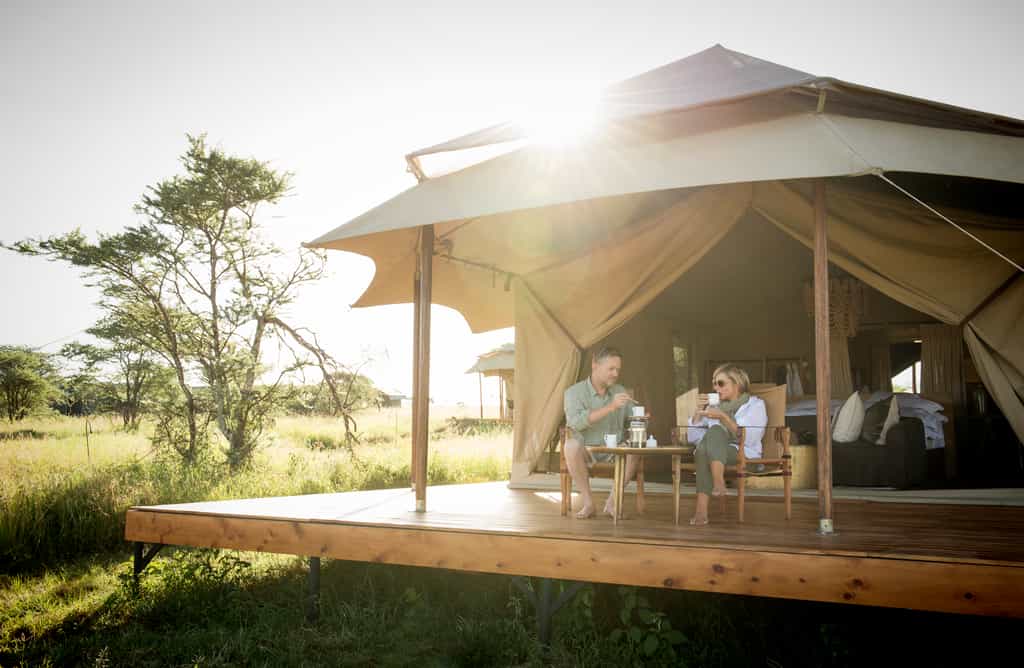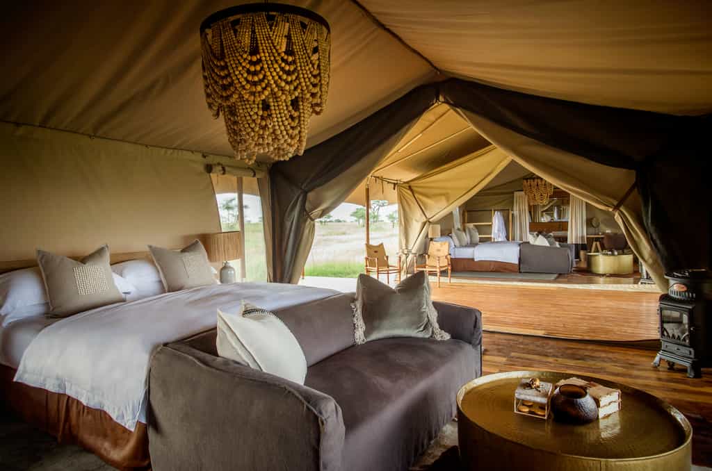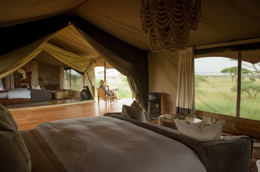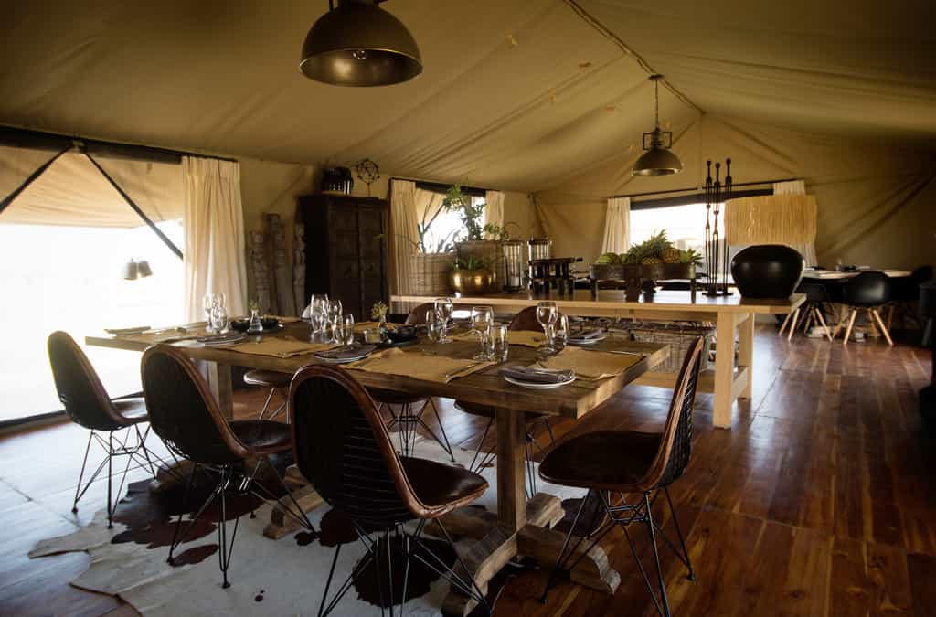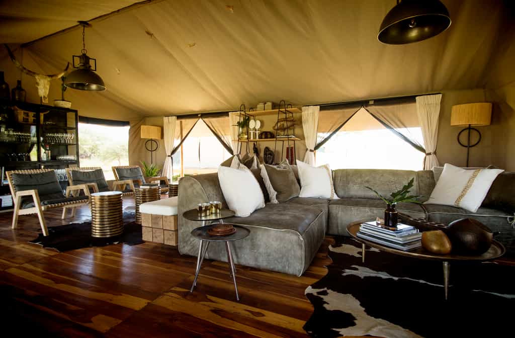 The dining and bar area sits on a raised Teak platform under canvas. It has an airy, open-plan feel, with sleek modern furniture in pale wooden tones, opulent dark fabrics, and thick woven carpets. The combination of rich, earthy tones - off-white, soft mushroom and warm browns - mirrors the natural hues of the surrounding bush. The lounge, with sumptuous couches, deep armchairs and a selection of reading books, has spectacular views across the Serengeti.
