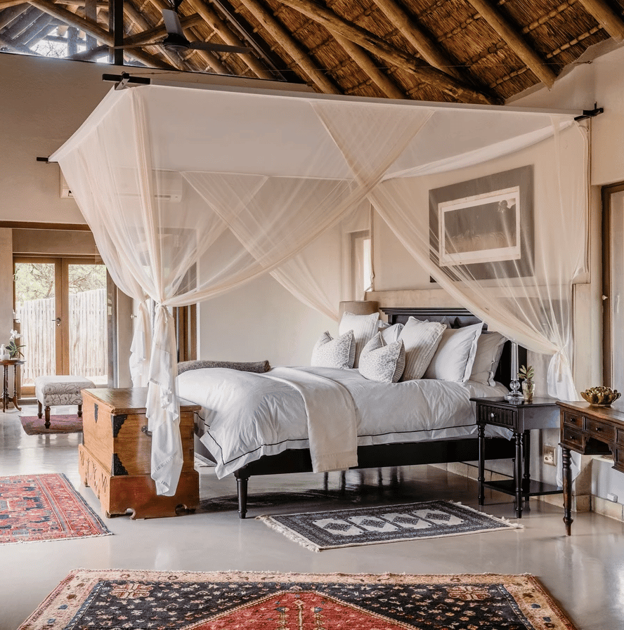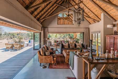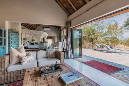 More a romantic bush home than a lodge, the main area has a spacious open-planned lounge, dining area and kitchen, where meals are prepared by your private chef. A washed, pastel colour pallet accentuates the rustic décor and tasteful modern furnishings. Huge fold-away doors blend the indoors seamlessly with the outdoors, and an outside lounge mirrors the comforts of inside, with a viewing deck and a rim-flow pool overlooking the river. The overall feel is one of elegant, sumptuous style without compromising on comfort.