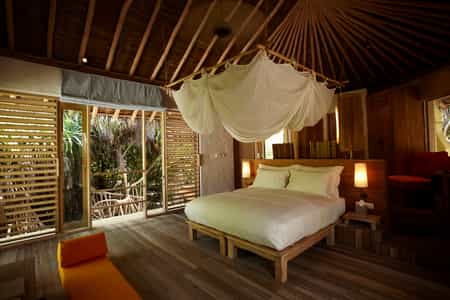 Assembled from sustainable, local materials, the air-conditioned villas have a king-size bed with a hanging canopy and an en-suite bathroom with basins set in old-fashioned trunks. Water villas provide the perfect spot to relax with a hammock slung above the lagoon, as well as easy access for snorkelling, a sunken lounge and private coral garden - and some have an infinity pool! The two-bedroom beach villas each offer a rooftop dining deck, a spacious lounge and large pool with loungers facing the sea - where sunsets are rather glorious.