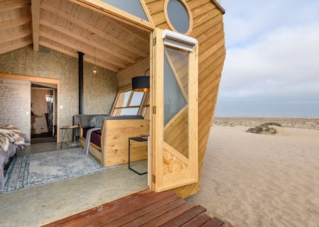 The lodge has 10 shipwreck-style rooms, all scattered along the coastal dunes. From the outside, they are simple timber structures but enter through the glass doors and you’ll find a soothing, blue-green colour palette and plenty of mod-cons. The large beds (either doubles or twins, depending on your preference) are draped in faux furs and plenty of blankets, and landscape windows offer stunning views of the ocean from between your toes. Bathrooms come complete with twin sinks, showers with porthole windows and plenty of hot water.