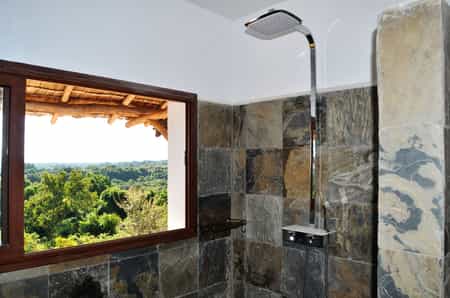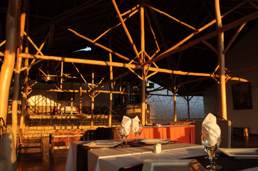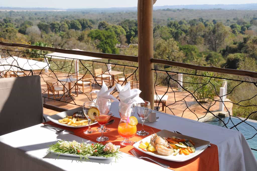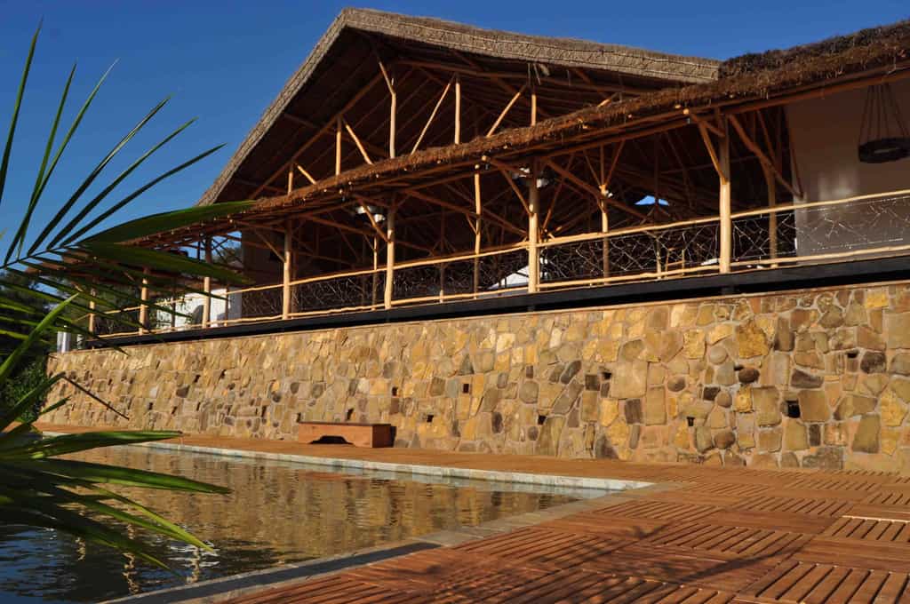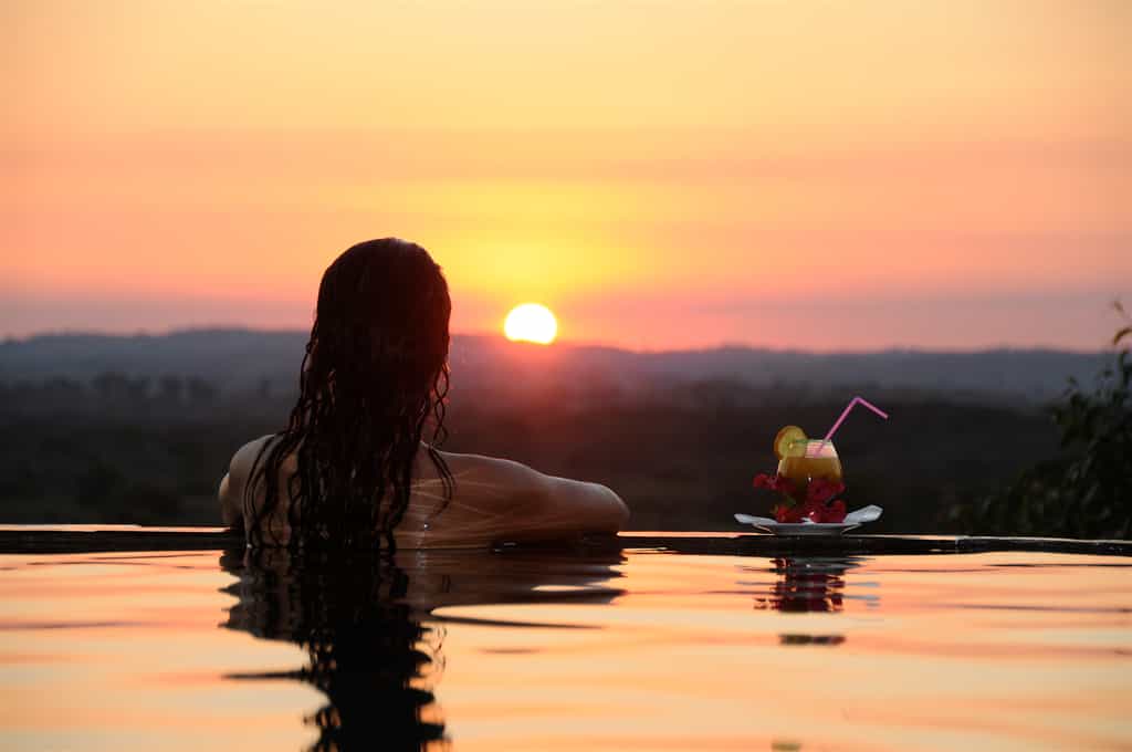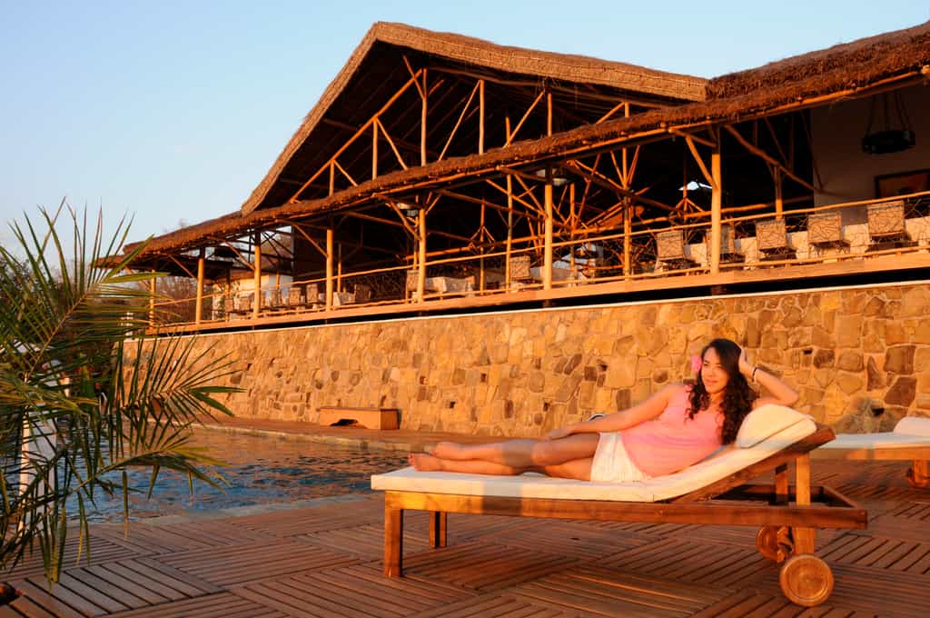 The main area is a vast open-plan dining room, bar and lounge beneath a soaring thatched roof, with wonderful views across the valley. A series of wide stone steps curves down to the wraparound terrace, which has a lovely infinity pool, plenty of space to soak up the sun, and a delightful outdoor dining area beneath the trees. Other facilities include a small curio shop and a children’s playground in the garden.