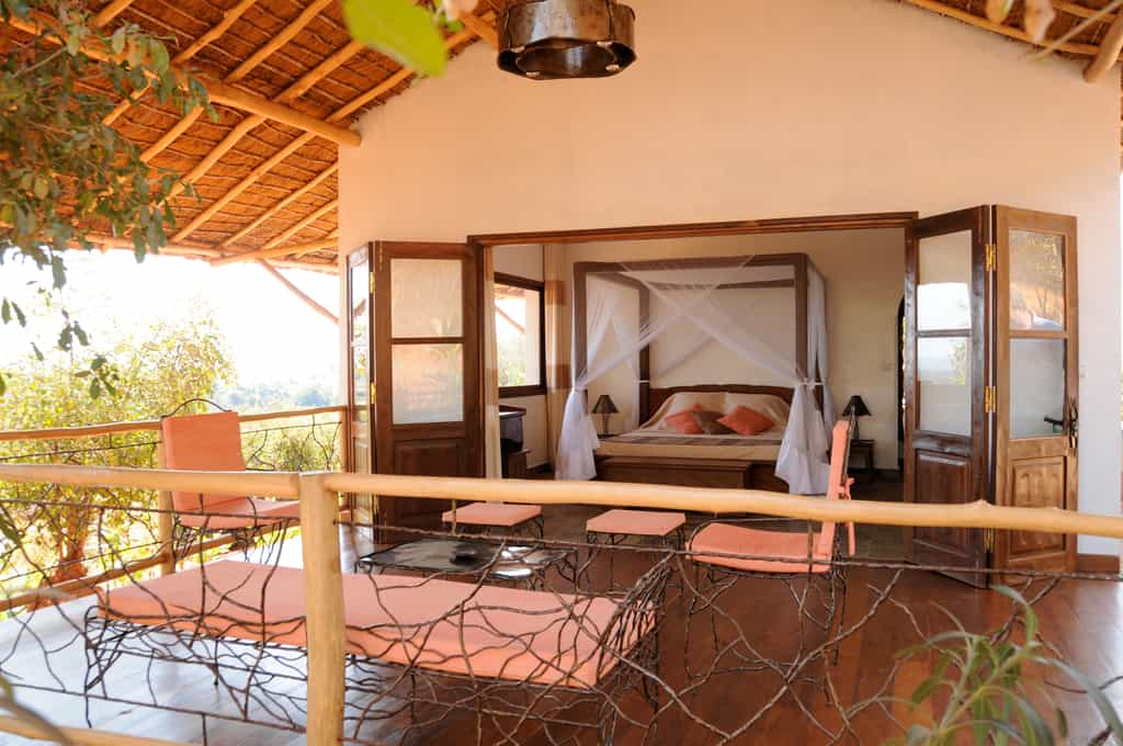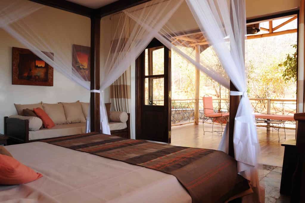 The spacious bungalows, set along the ridge, have cool interiors featuring a blend of natural timber, pale stone walls and rustic thatch. Vast four poster beds with mosquito nets face to the private terrace, and the décor is simple and understated, with soft corals and earthy tones creating a delightfully calm effect. Each bungalow has a sofa that can be converted into an extra bed if required, and a stone-walled en-suite bathroom with a huge walk-in shower and modern fittings.