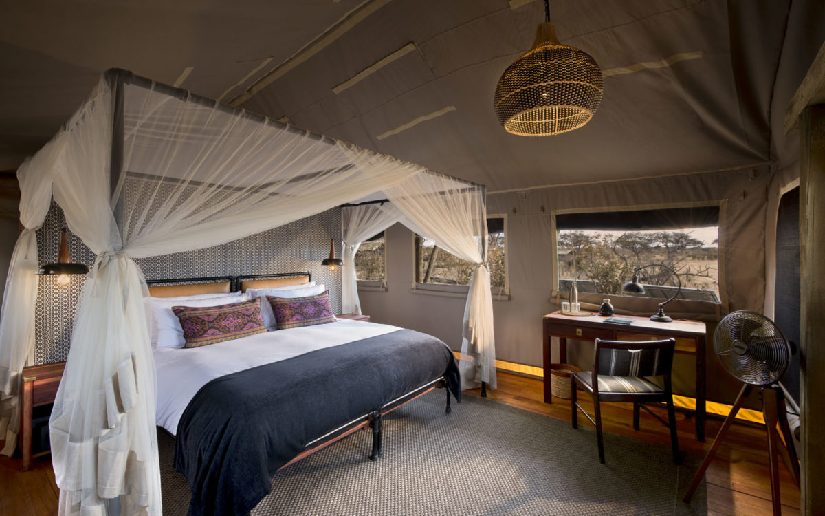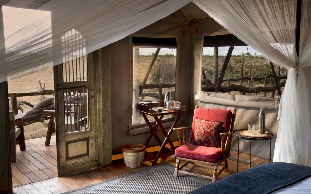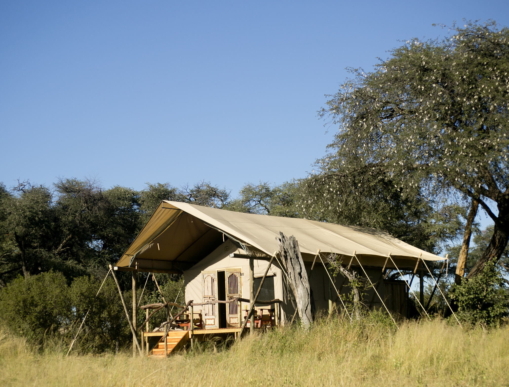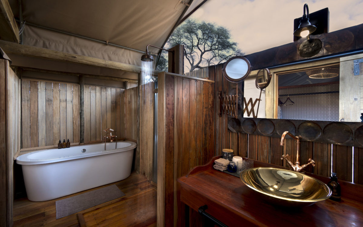 There are seven two-person, simple but elegant A-frame tents with foldaway flaps and zip-down doors. Out the back of the tent is the alfresco bathroom with shower, toilet and a single basin. Tents make good use of their space, fitting in a writing desk a small dressing area and two cushioned chairs. Out front of each tent is a small deck, each with unobstructed views across the plain. Solar powered bulbs ensure light around the clock and bucket showers are heated.
