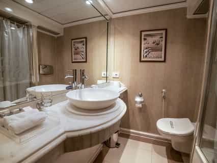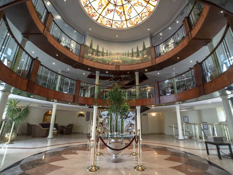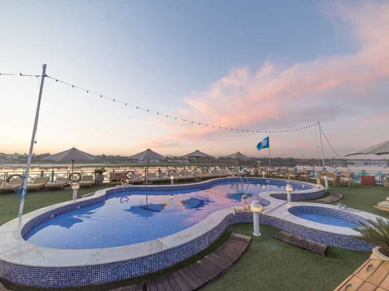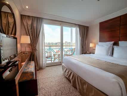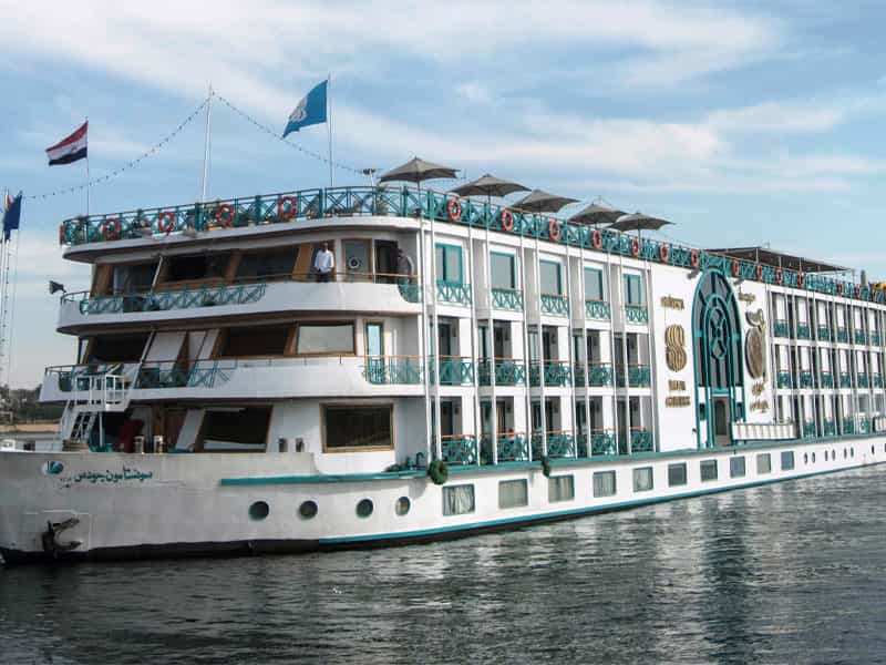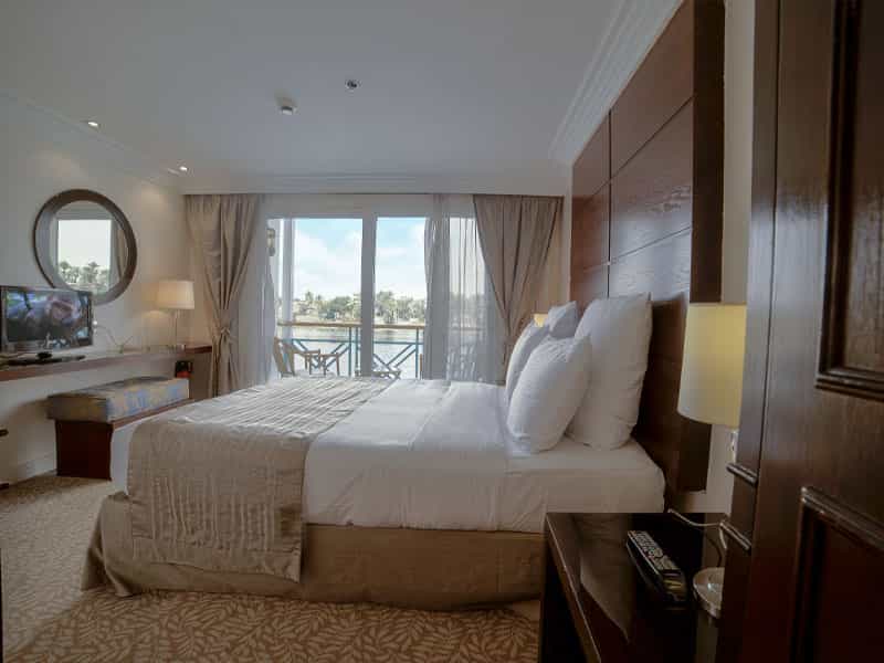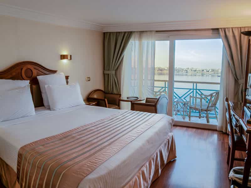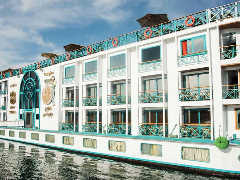 Sonesta Moon Goddess Nile Cruise Ship offers 49 luxurious cabins with sliding glass doors opening to private balconies and 4 presidential suites with a private lounge. All accommodations feature their own private balcony. Sonesta Moon Goddess docks in Luxor at PNC Dock, before Luxor Bridge and docks in Aswan at Nile Dream Dock