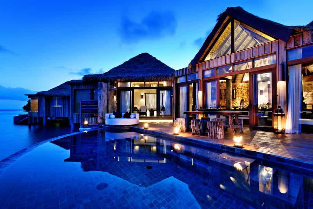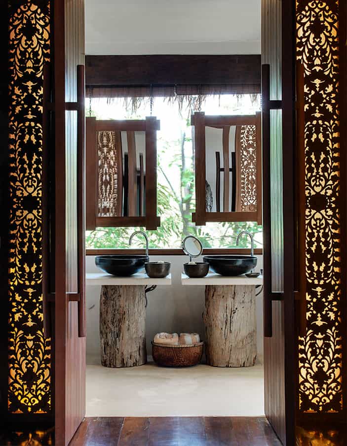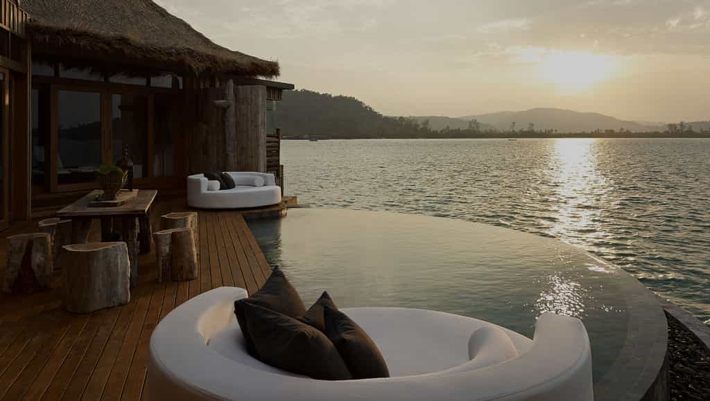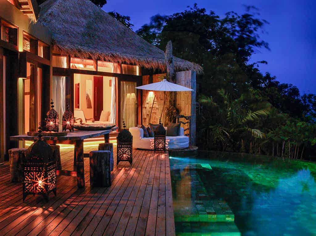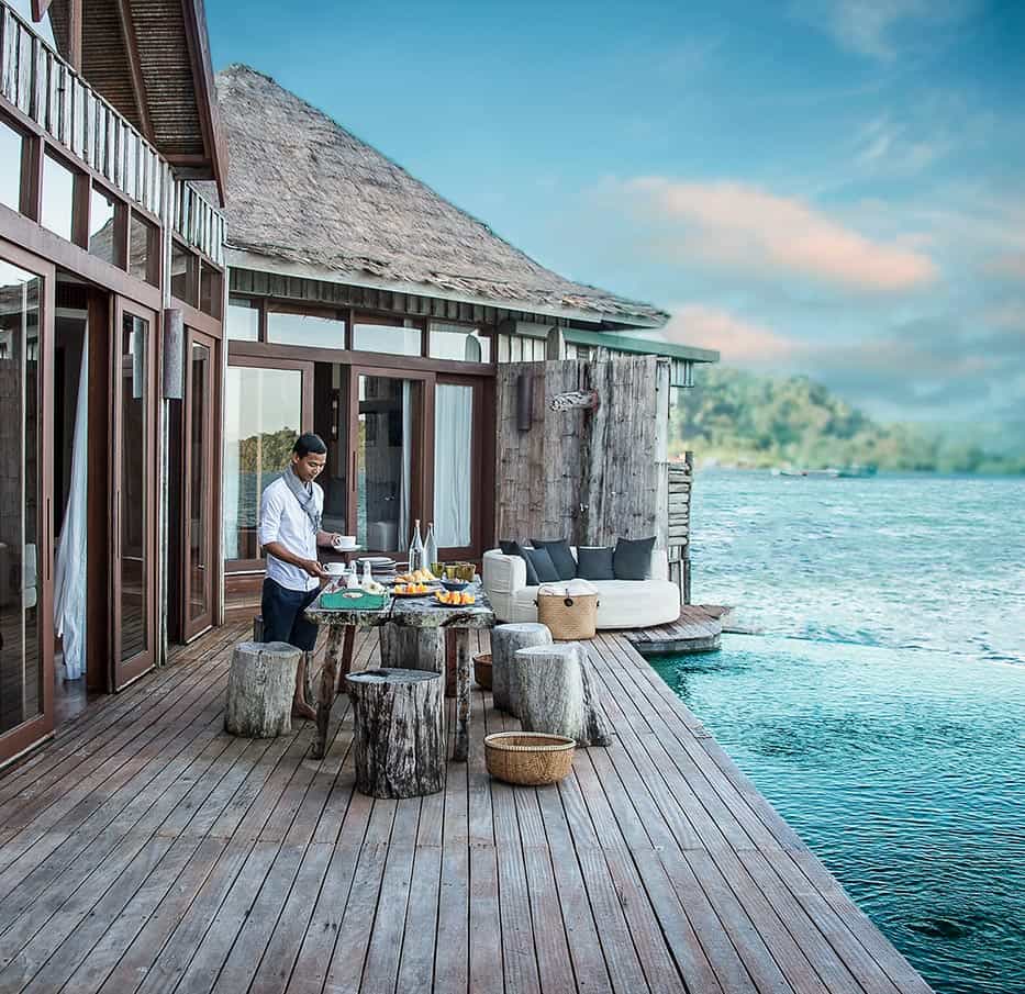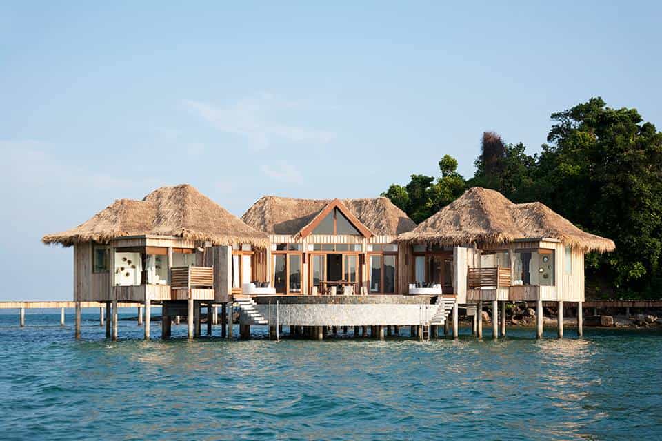 There are 27 palm-topped villas decorated with rustic wall carvings, driftwood tables and temple-style lanterns (upcycled from oil drums). Equal parts island chic and classic Cambodia, the villas are built in the rainforest (with trees that grow up through the deck) on a private patch of the shoreline or on stilts over the ocean where you can watch the reef activity through the floor. Each has a roomy bed wrapped in netting, lovely sunken bathtubs, a dining area (some outdoor) and pool. The Royal Villas are the most grand with a jetty (you can book a private longtail boat), large dining area and exquisite pool - there's nothing stopping you from jumping straight into the sea.