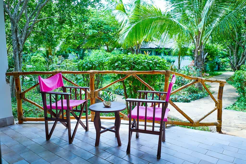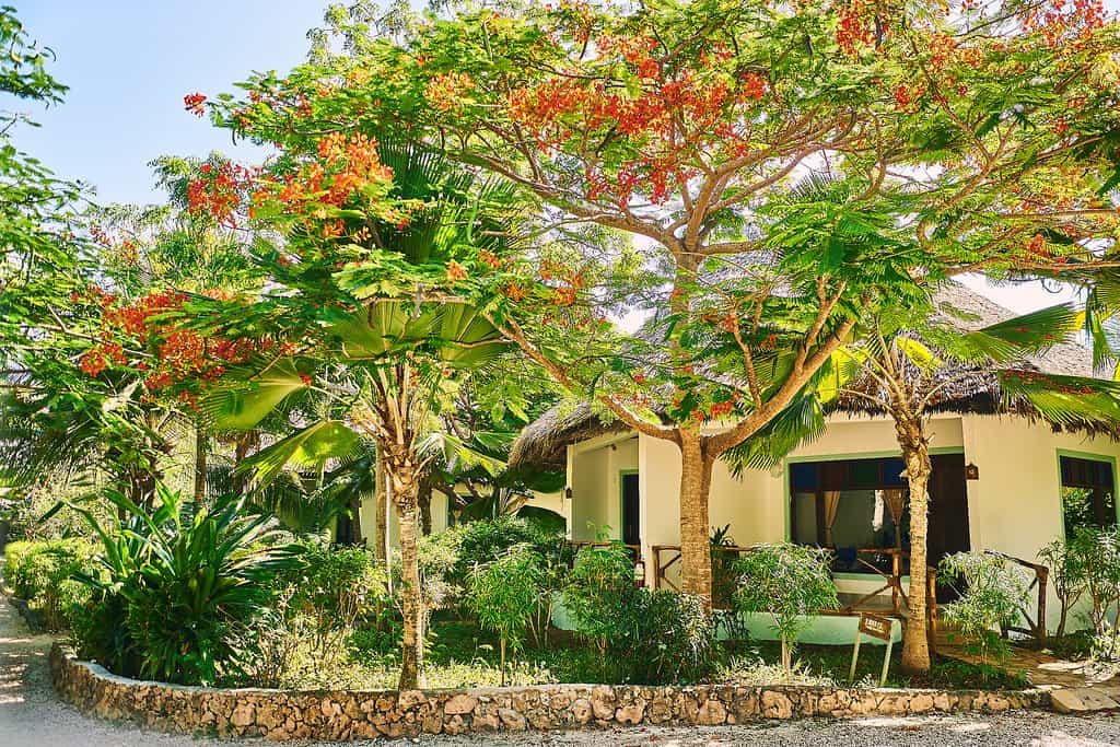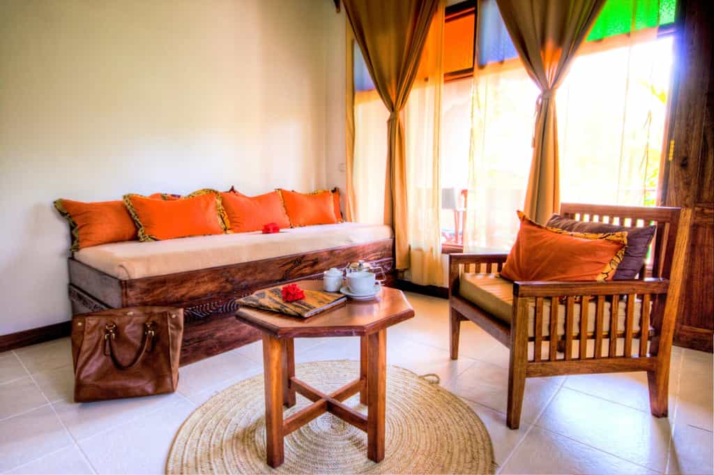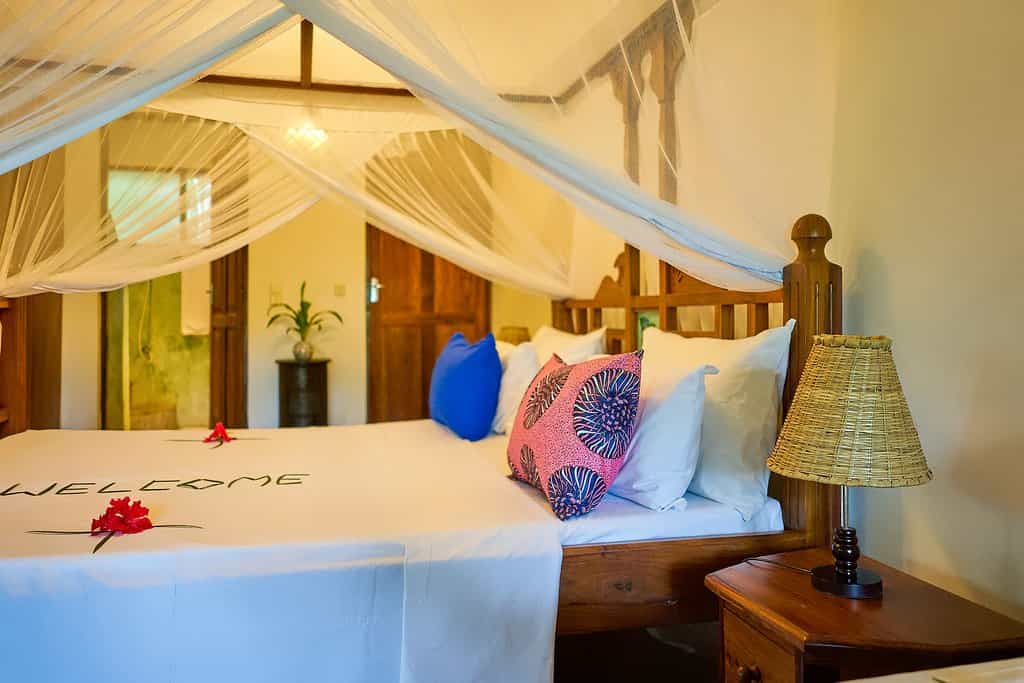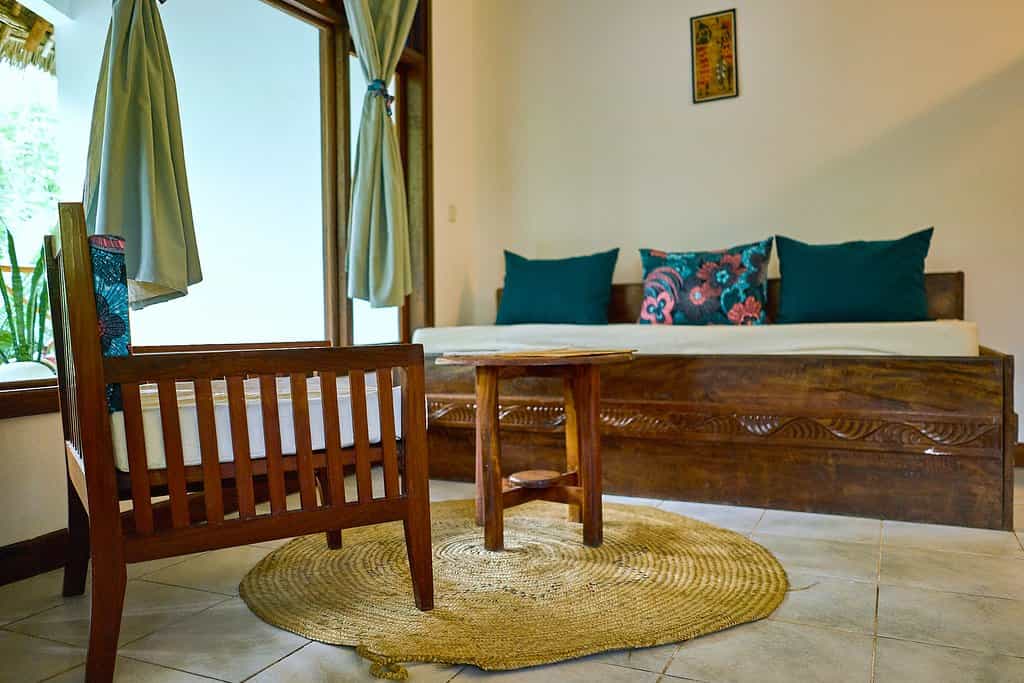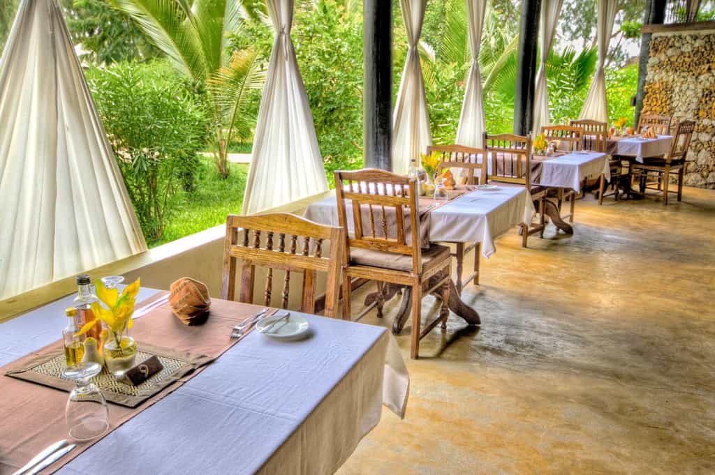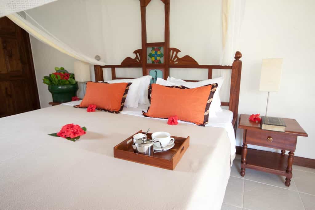 The resort has a range of classic thatched bungalows and ocean-front suites. Each has a large canopied bed and a lounge designed with a blend of colours and influences from Zanzibar to India. Most en-suite bathrooms are decked out in sage-green stone with an open-air shower and the rooms all come with a private patio. The suites have a luxury touch with a library, espresso machine, butler and access to a private beach. Other amenities include a vanity table, air-con and a safe.