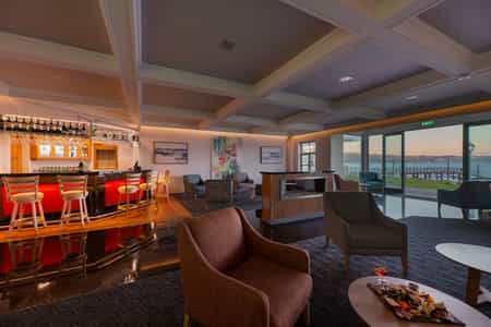 There are two large, 'Victorian-esque' structures on the estate: the Manor House and the Courtyard. Between them are manicured lawns with orderly rows of sun loungers, an outdoor patio area around a koi pond, a large swimming pool, and plenty of seating under shady gazebos. The Manor House has a large open lounge with sofas arranged around a wood-burning fireplace. Adjacent to the lounge is the Paquita Bar and Twin Palms Restaurant, with views over the lagoon.