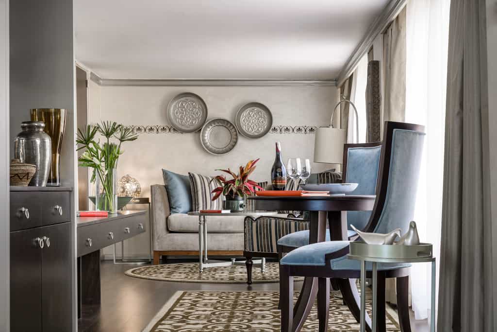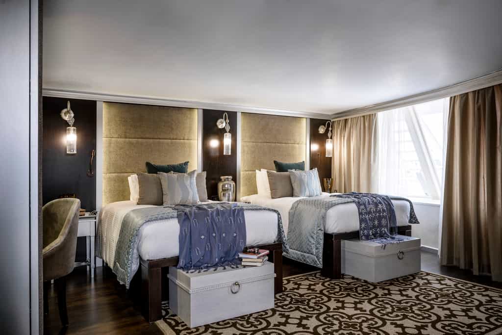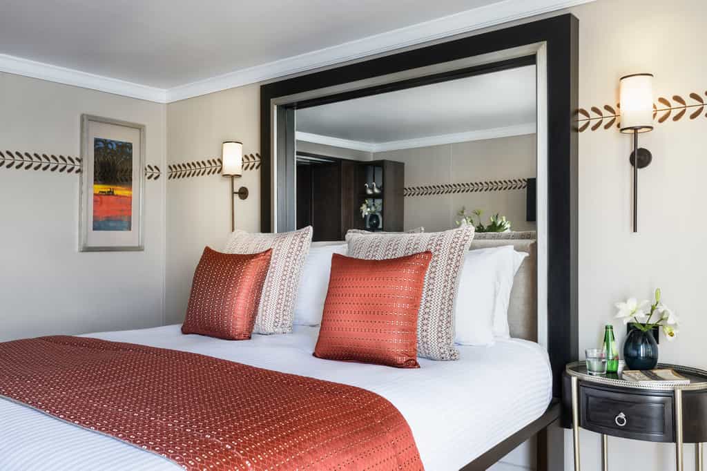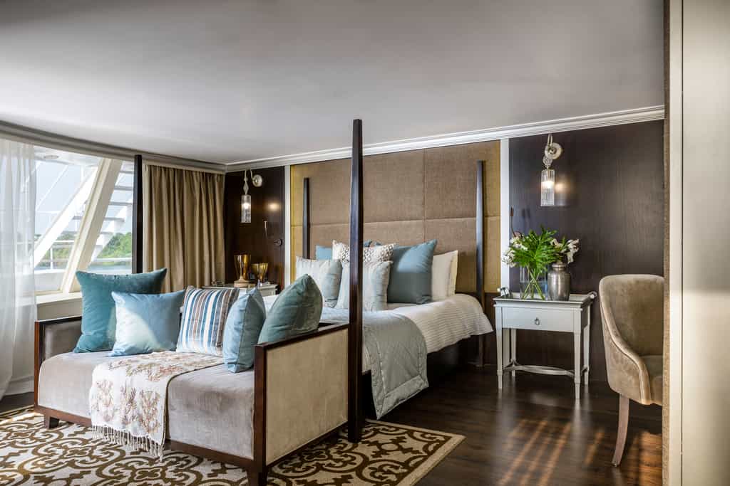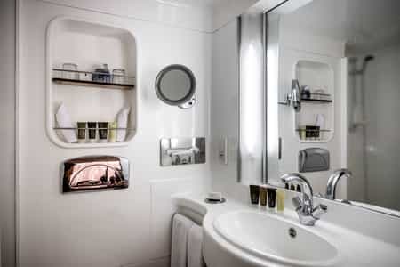 The cabins have a rich, Oriental style with striking details, cool, metallic textiles, and dark wooden furniture. Most rooms have floor-to-ceiling windows, which you can enjoy without having to leave the King-sized bed. The royal suites come with a private balcony and particularly opulent decor, and all suites boast a small lounge area. Other amenities include a dressing table, mini bar and TV with satellite channels. The bathrooms are well-appointed with a shower and high-quality toiletries.