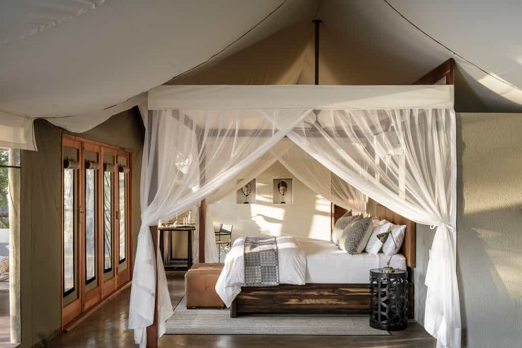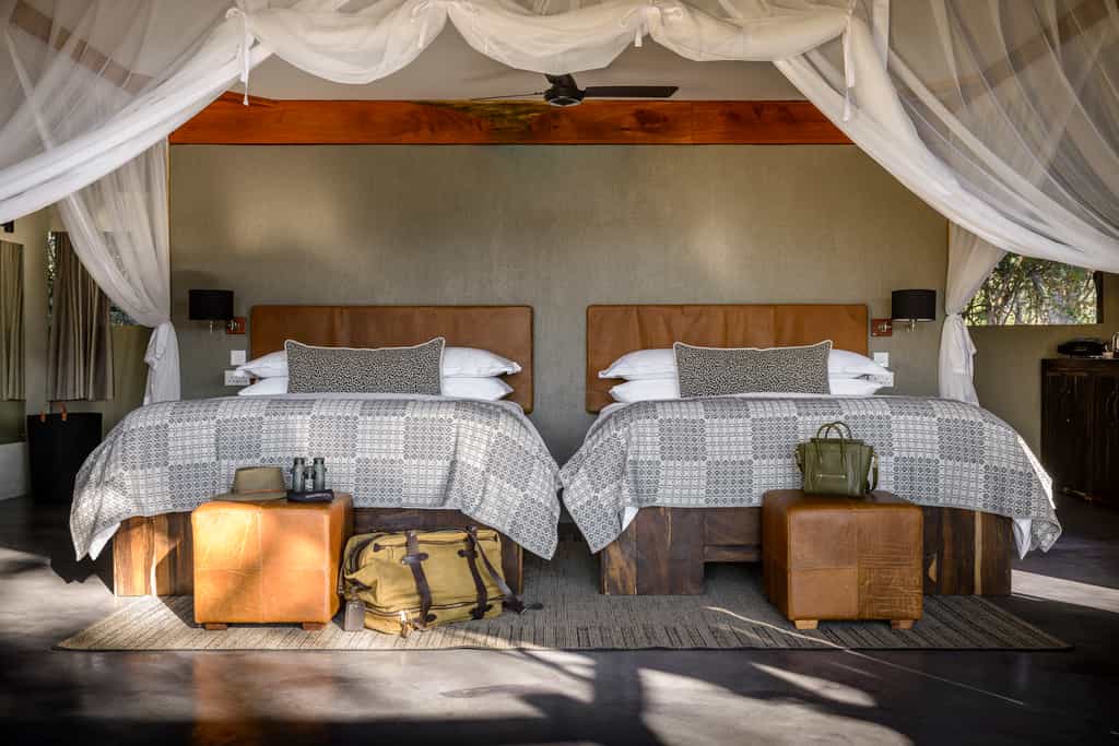Set apart from the main lodge via stilted wooden walkways, Sungani has seven luxury tents with a combination of canvas and glass walls and concrete floors to keep them cool. The style is understated with neutral tones, locally-made decor and chunky wooden beds draped in netting. The bathrooms are a treat with double vanities, brass detailing and slipper tubs in front of expansive windows. The Director's Tent is top prize with alfresco beds, a Nespresso machine and spacious lounge area.