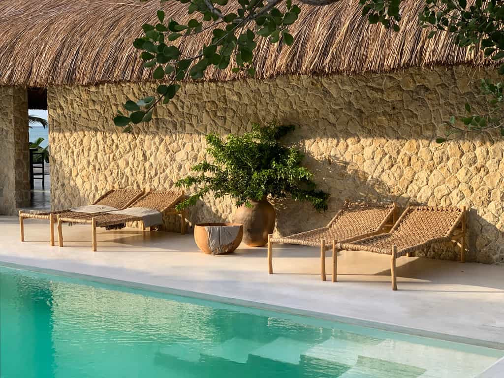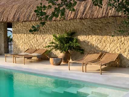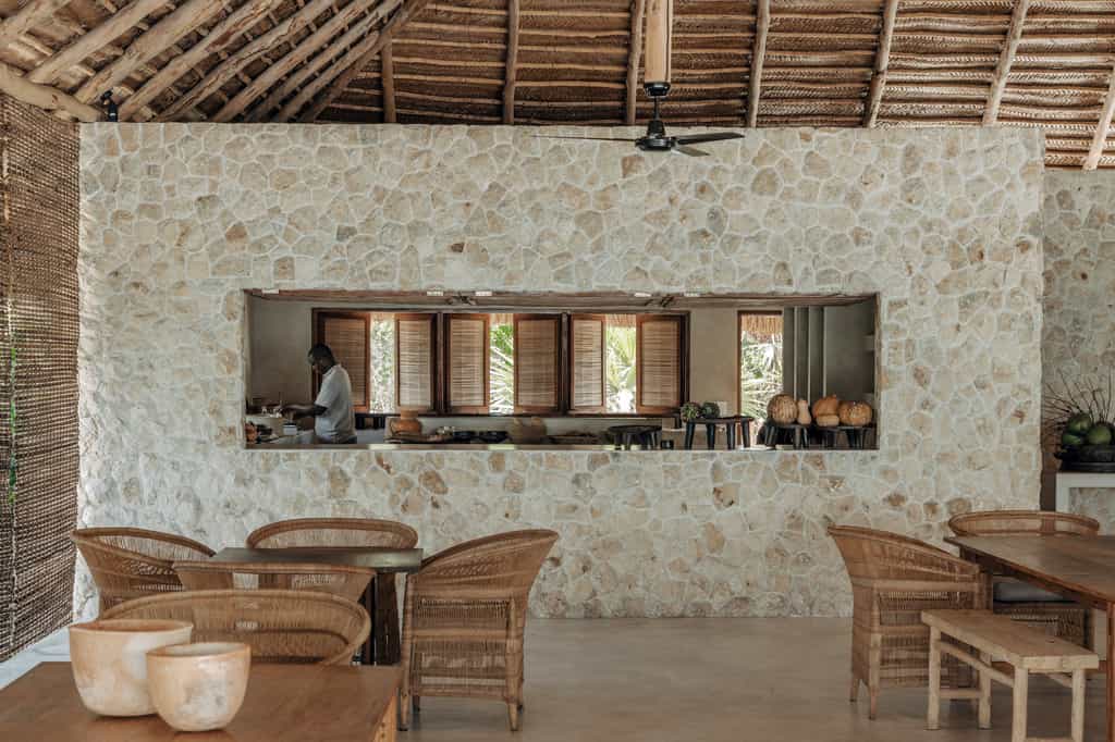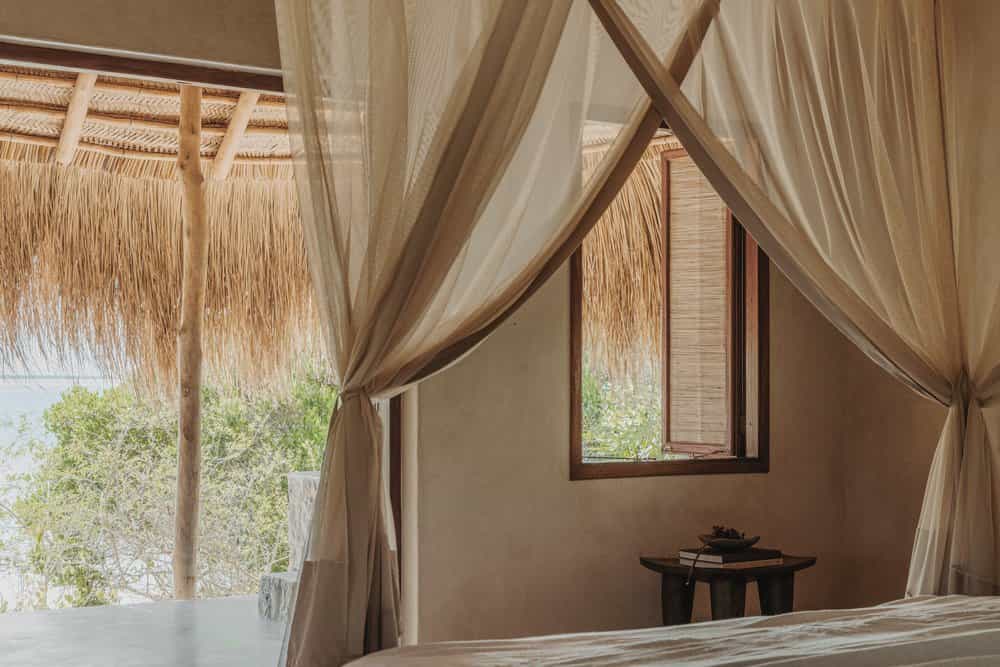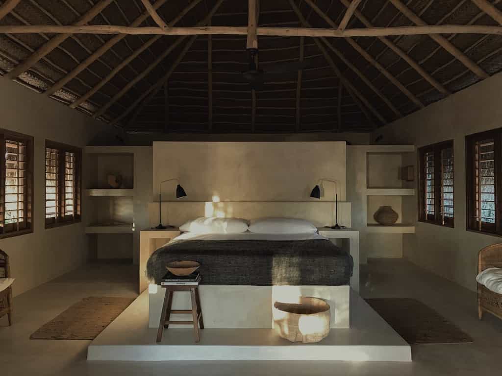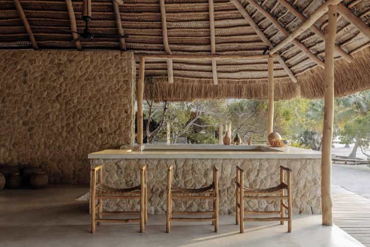Private bungalows provide over a thousand square feet of personal space surrounded by nature. Each suite includes indoor and outdoor bathing facilities and generous water front verandahs. Mozambican vernacular architecture weaves a natural canopy above billowing mosquito nets. Large apertures allow the colours of an ever changing landscape to permeate the space. Rooms are dressed with furniture created and carved onsite and thoughtfully collected artisanal pieces from sub-saharan African.