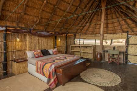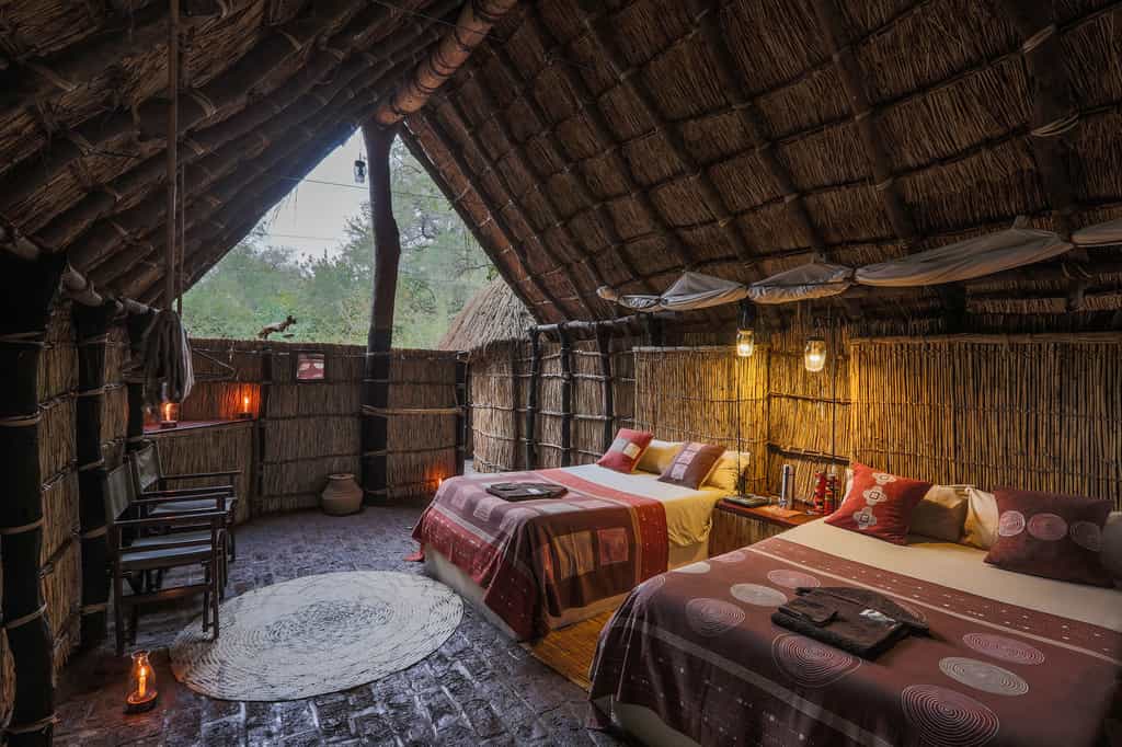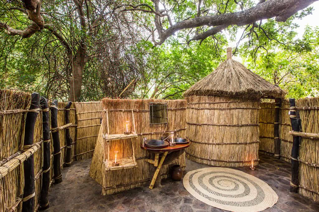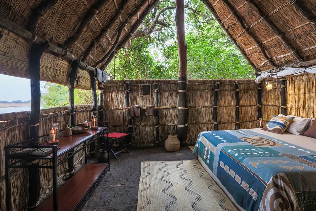 The 6 simple reed and thatch chalets are dotted around the lawns in the shade of the trees with magnificent views of the winding river. All are spacious and homely with locally made furniture inside and lovely built-in seating areas outside. The family chalet has 2 bedrooms and a bathroom, all cleverly built around a sausage tree for maximum privacy. All bathrooms are open to the stars and often shared by the very sweet resident tree frogs.