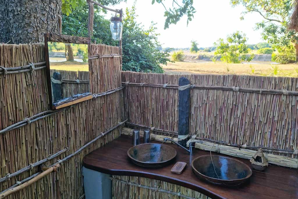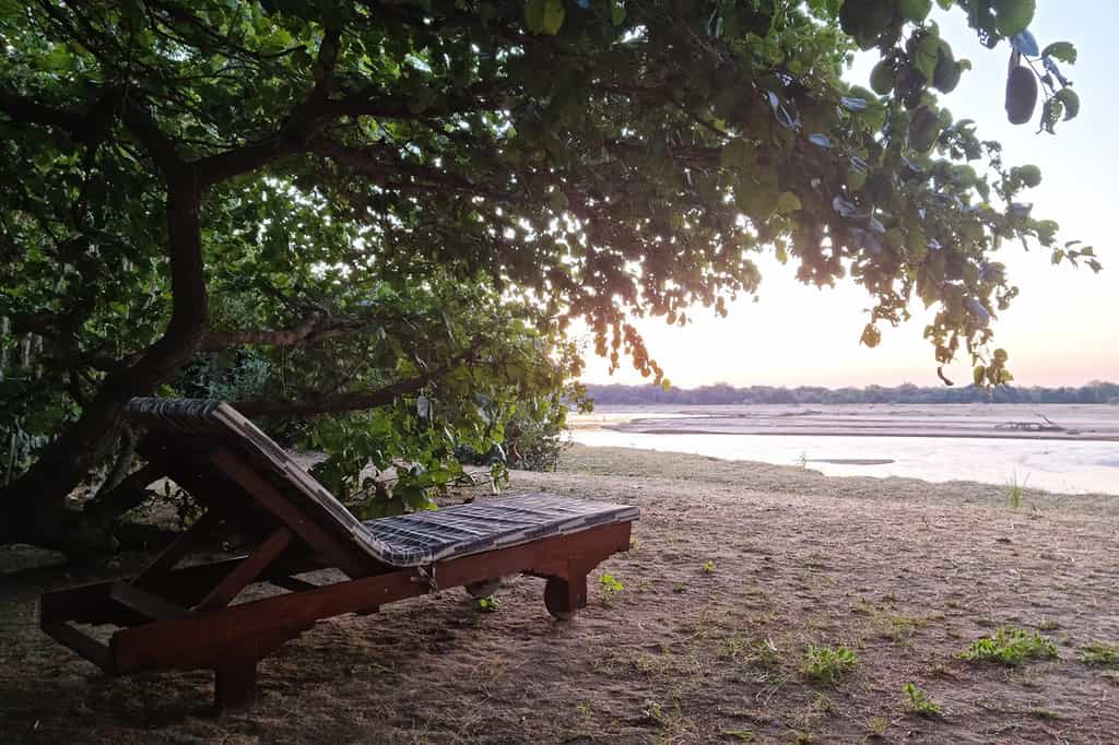 The main area is little more than a slightly raised tent surrounded by wooden decking. From here you have a panoramic view of the landscape and unfolding drama. Creature comforts come in the way of comfy sofas and chairs (in natural North Luangwa hues), a long table where guests dine with their guides, and solar power throughout. And what would a bush camp be without a campfire? This one offers full views of the river and the diamond-studded night sky.
