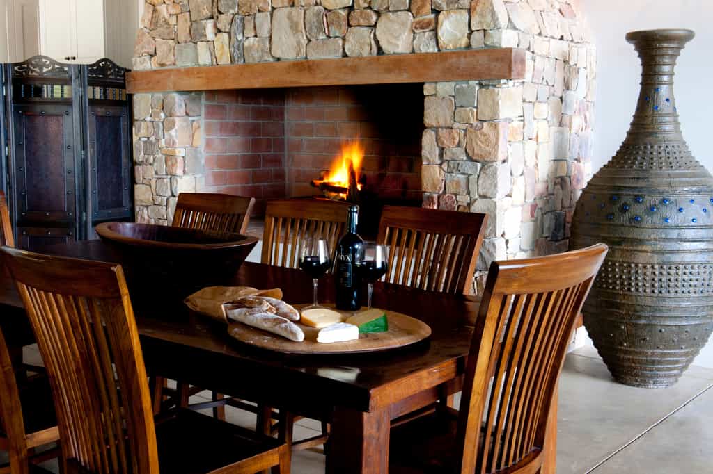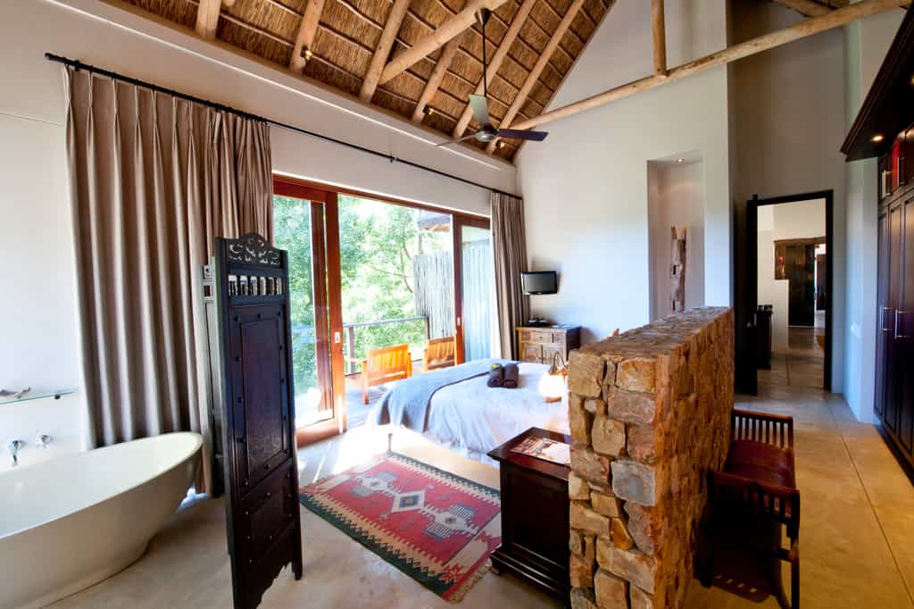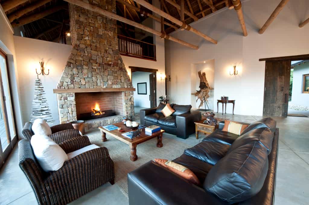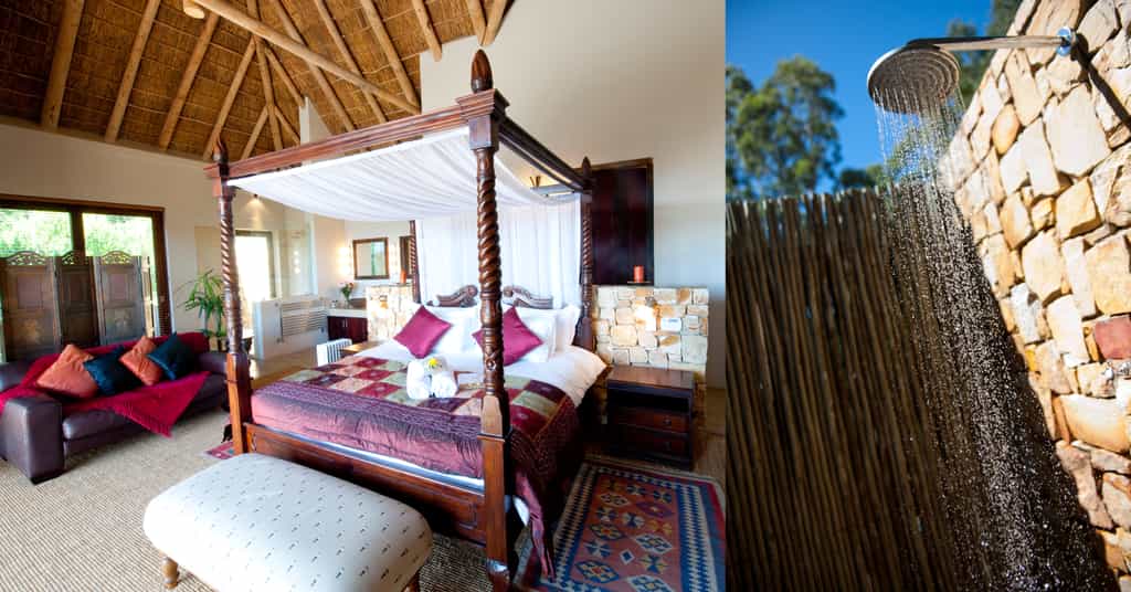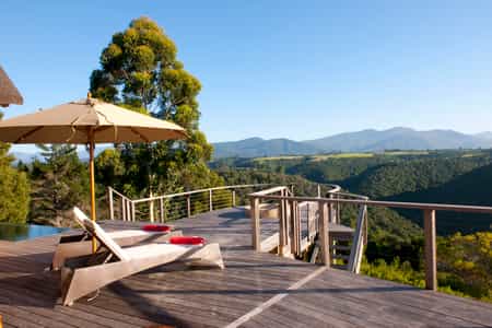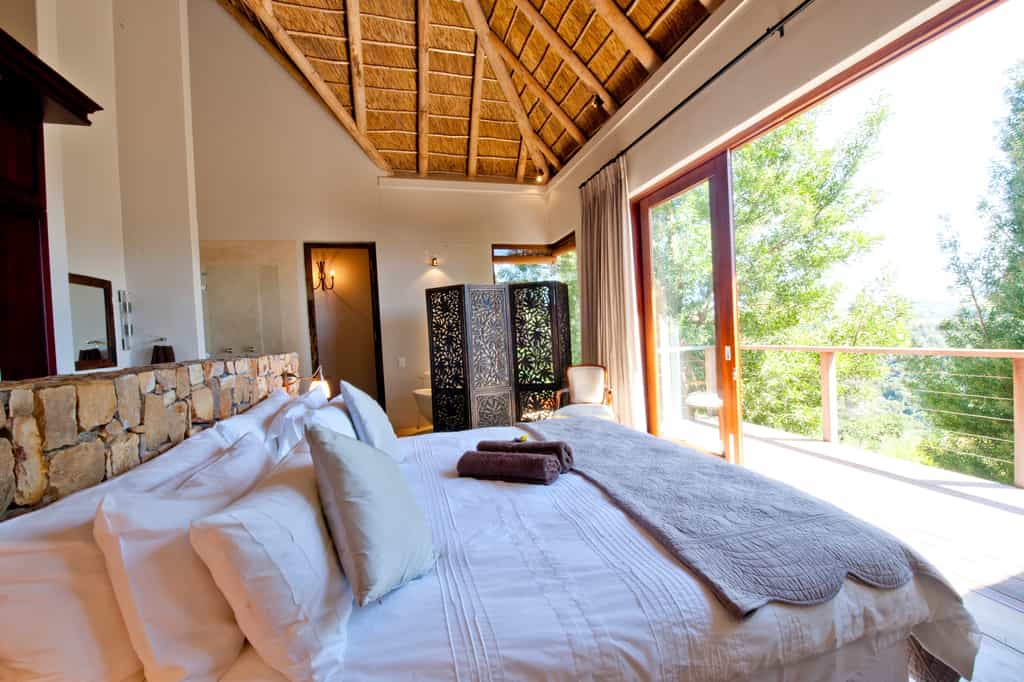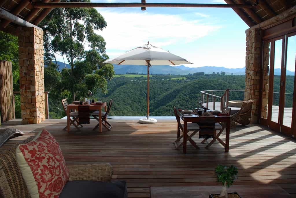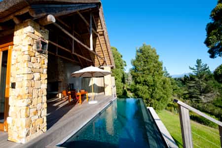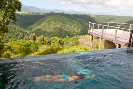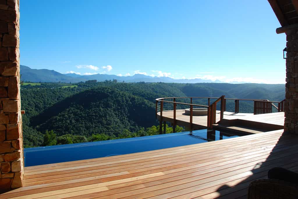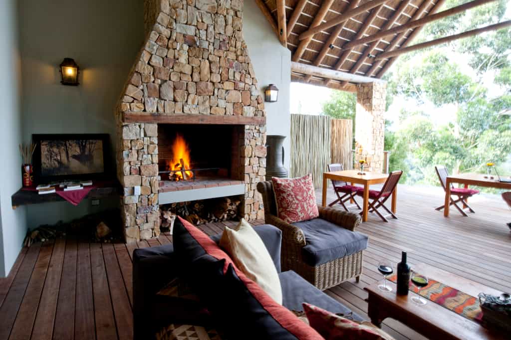 Tamodi's resembles a classic safari-style lodge , with thatched roofs, exposed beams, packed stone walls, and elevated timber viewing decks facing the densely wooded valleys and mountains. A cosy library and two comfortable guest lounges have several open fire places for winter days, with a swimming pool and sun lounge for summer, and a wine cellar that carries an excellent selection of South African labels. Breakfasts are served fireside, or out on the deck.