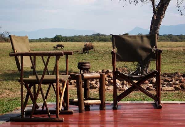 Four chalets and six tents each sleep two guests in double- or twin-bedded comfort. The chalets and tents have identical amenities – an en-suite bathroom with double basins and a shower, hot water, electricity, and fans to cool you on hot summer nights. The tents are canvas-walled in that authentic safari style, with large windows and a clean, uncluttered feel. Bothchalets and tents have large shaded porches, perfect for midday lounging.