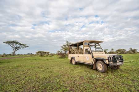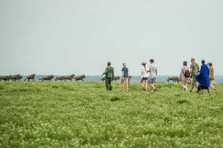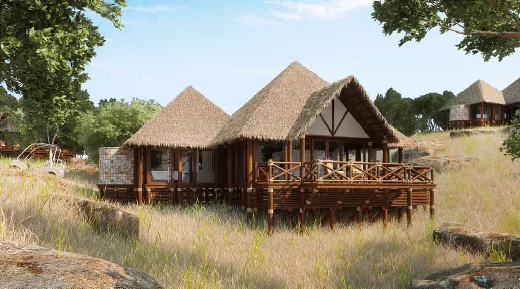 The main area is a large thatched complex, slightly raised on wooden stilts on the hillside, with magnificent views across the savanna below. Lower down the slope, a huge rim-flow pool with sunloungers is both cooling and a great vantage point. Inside, the decor is brand new and stylish. Comfortable sofas and plush armchairs make the perfect spot to relax between activities, and the dining room conjures up a romantic yet modern camp feel at mealtimes.