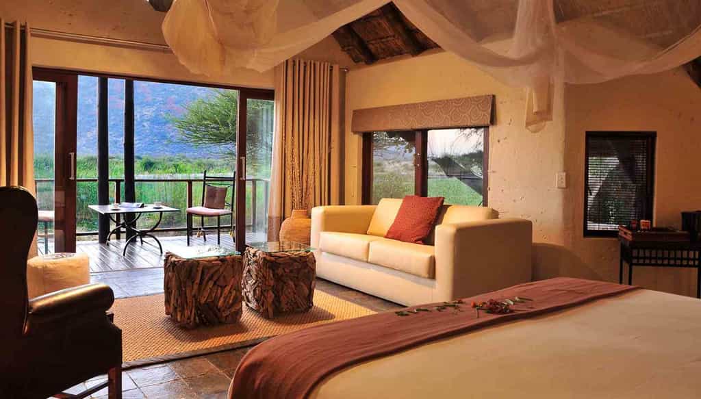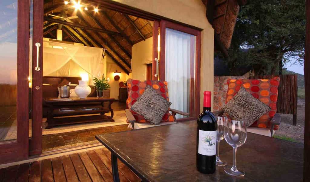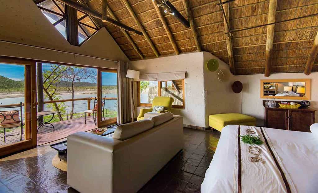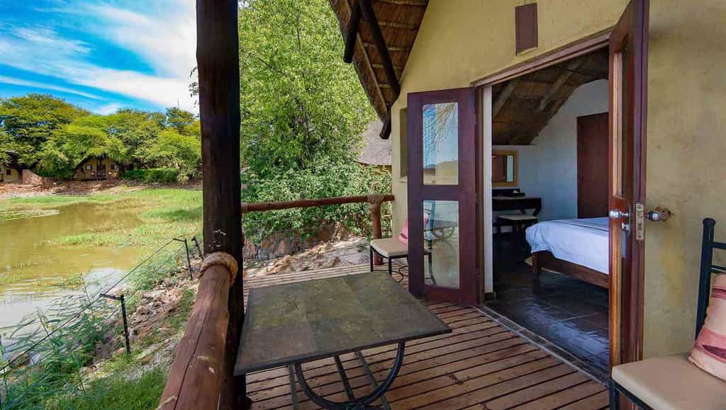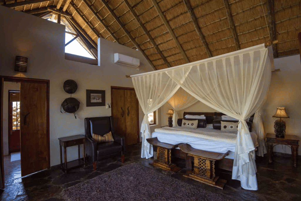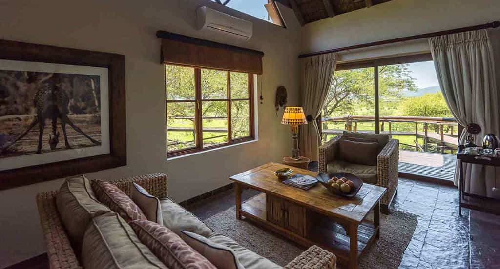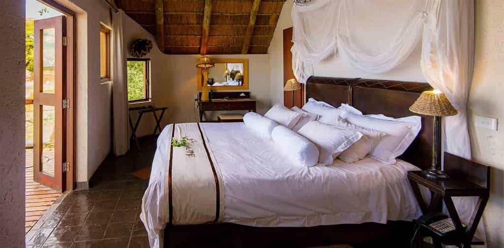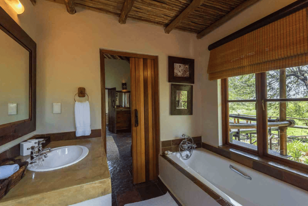 Each of the thirty luxurious chalets are spread out on either side of the central lodge, with private viewing decks overlooking the waterhole. Each is crafted from natural materials, including thatch roofs and stone floors, with warm earthy tones and beautiful linens.. The larger Deluxe Chalets are perfect for families sharing a room, and the Family Suites have two interleading bedrooms and a lounge. All rooms are en-suite, with outdoor showers, air conditioning and ceiling fans, and are super spacious.