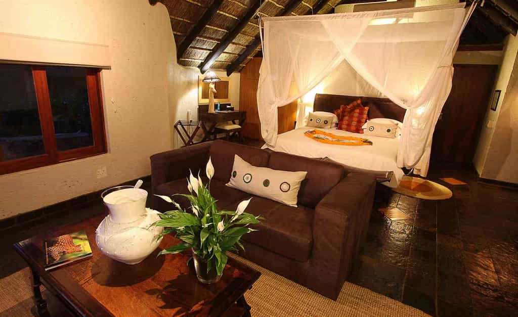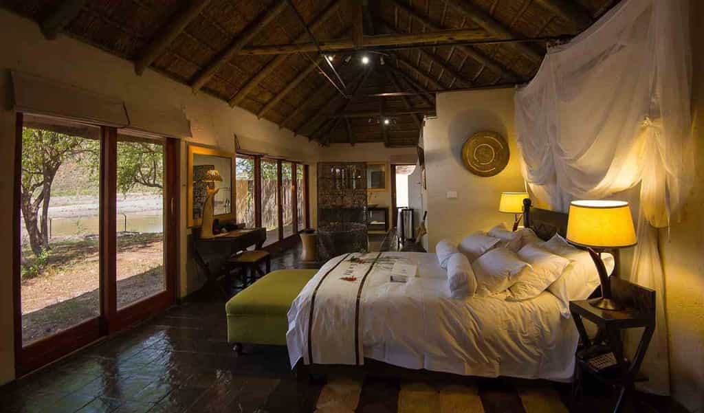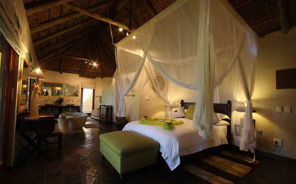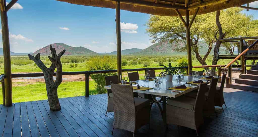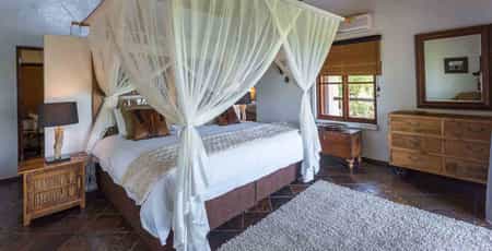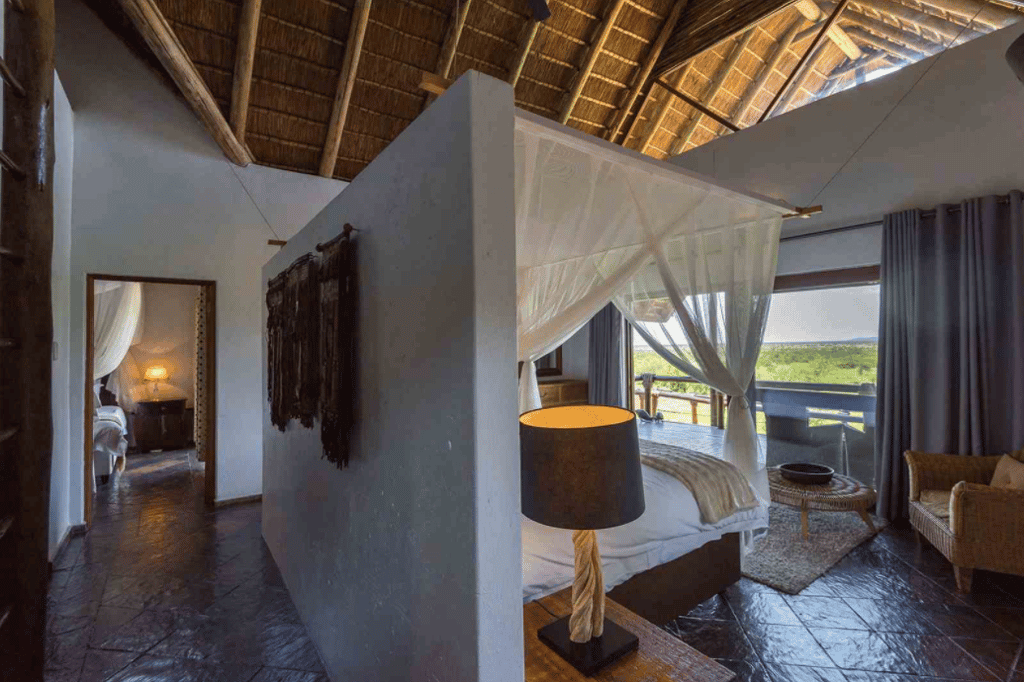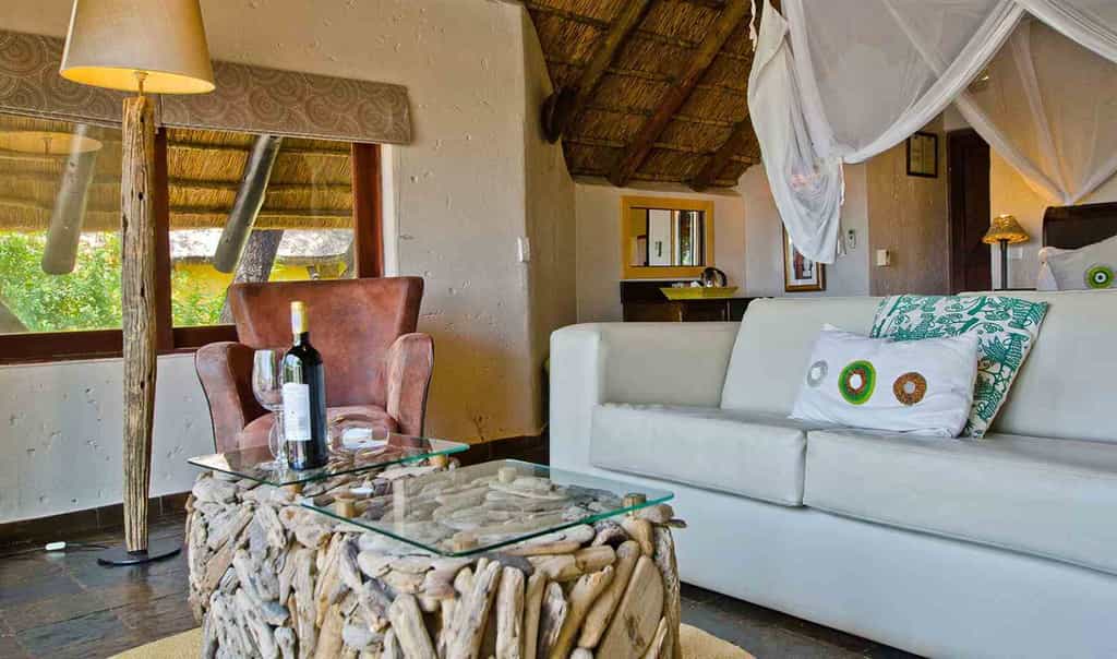 The central lodge area flows over two levels beneath vaulted thatched ceilings, with a huge lounge, bar and dining room. Outside, there's an open air viewing deck overlooking the waterhole, and a swimming pool with plenty of sun loungers for wildlife-watching as you relax. There’s also a well-stocked curio shop, and beautiful spa and wellness centre. Breakfast and lunch are served buffet-style in the dining room or out on the veranda next to the pool, with lavish boma dinners under the stars or in the thatched boma alongside the main lodge.