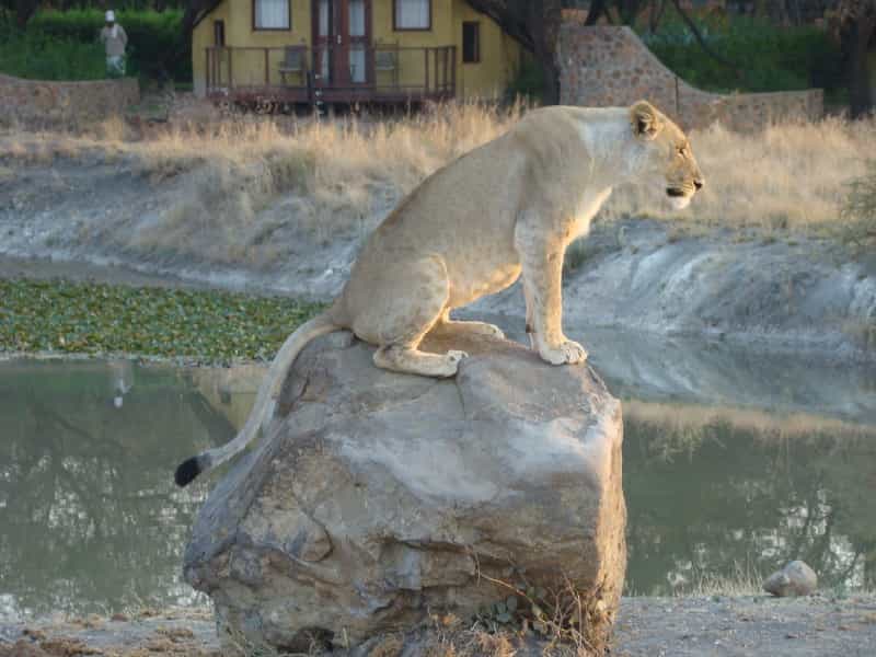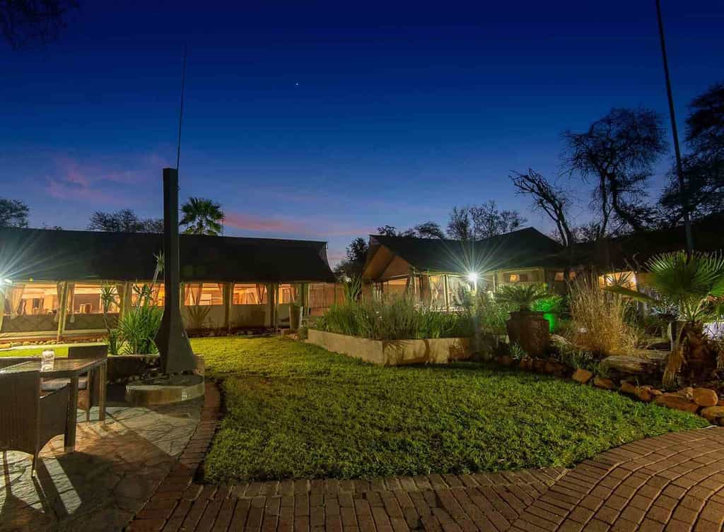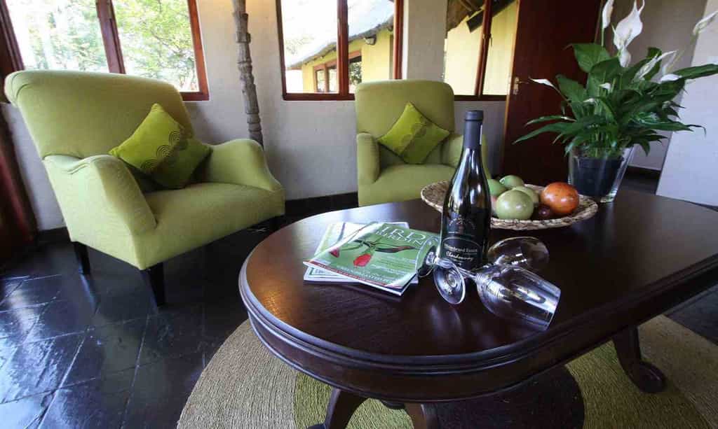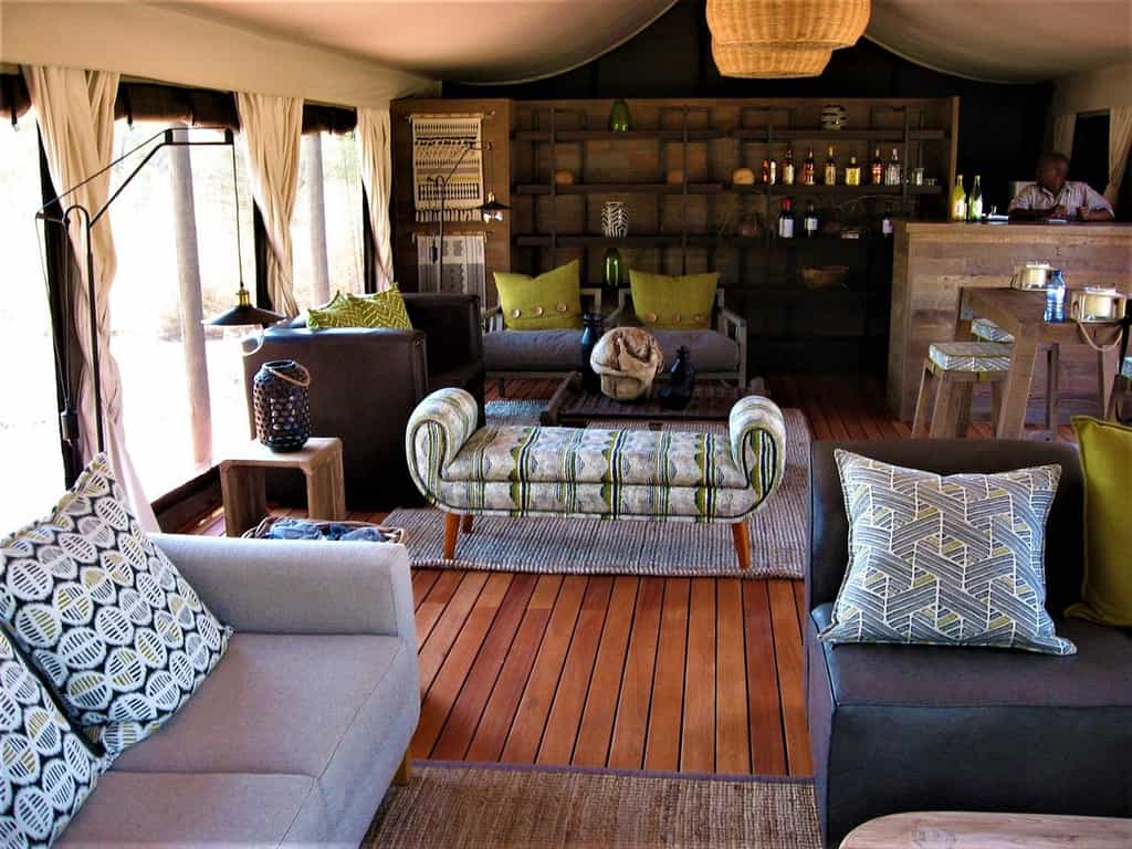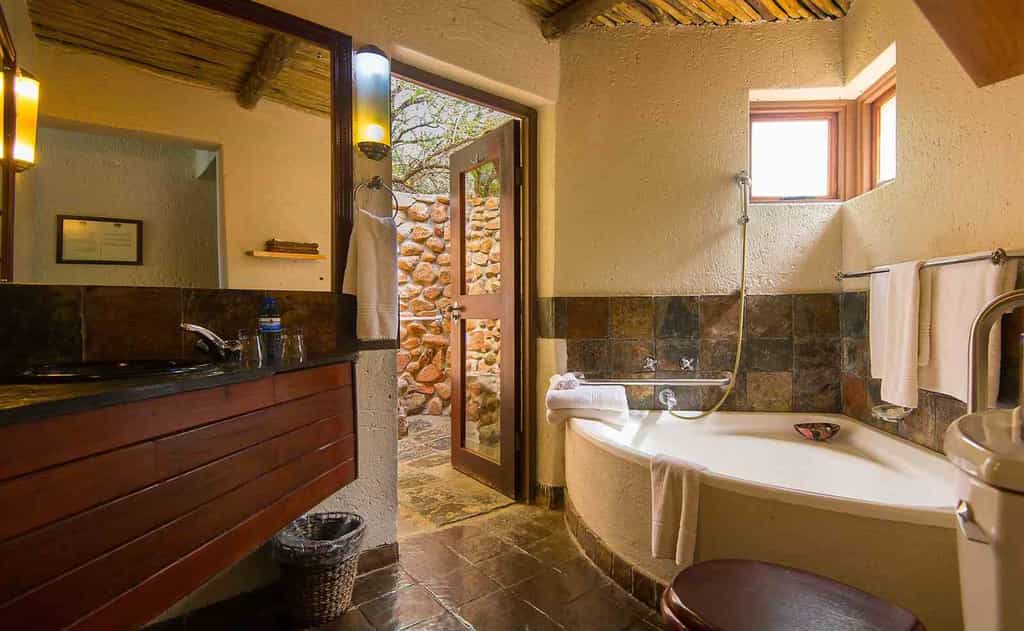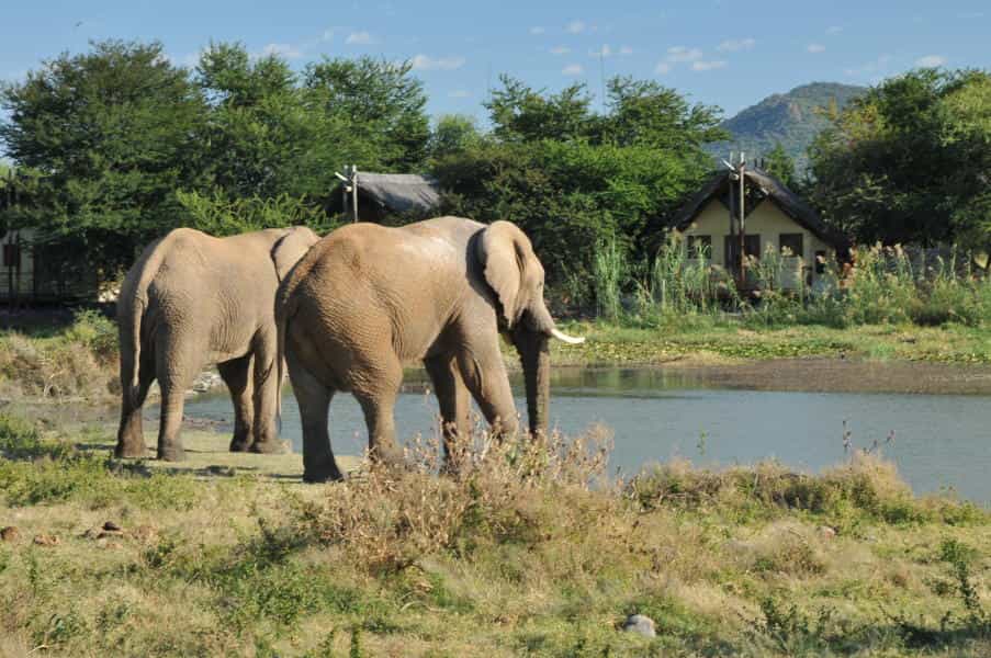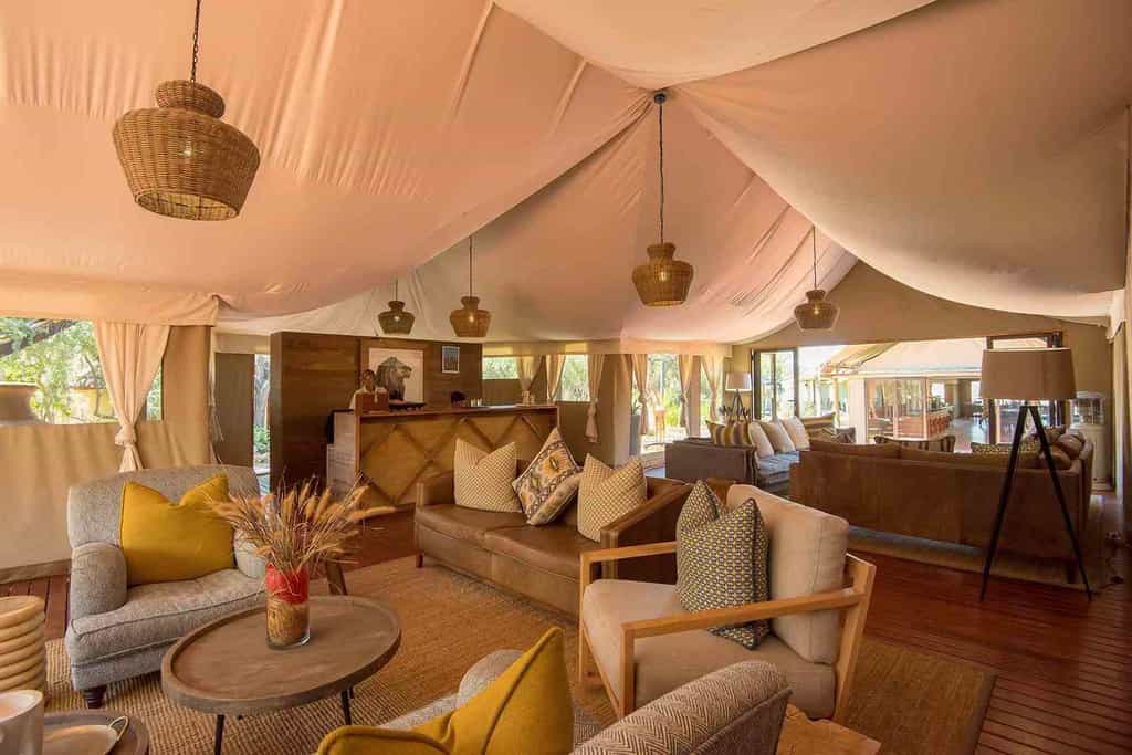 The central lodge area flows over two levels beneath vaulted thatched ceilings, with a huge lounge, bar and dining room. Outside, there's an open air viewing deck overlooking the waterhole, and a swimming pool with plenty of sun loungers for wildlife-watching as you relax. There’s also a well-stocked curio shop, and beautiful spa and wellness centre. Breakfast and lunch are served buffet-style in the dining room or out on the veranda next to the pool, with lavish boma dinners under the stars or in the thatched boma alongside the main lodge.