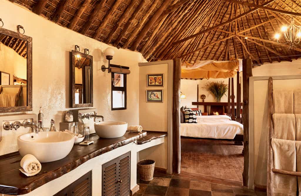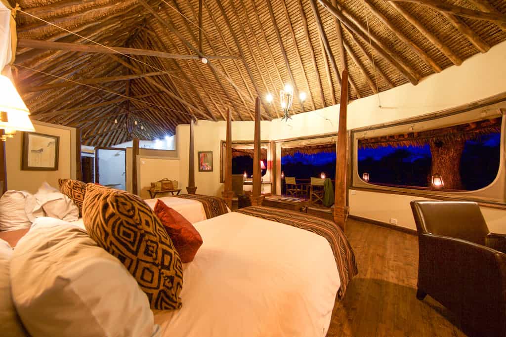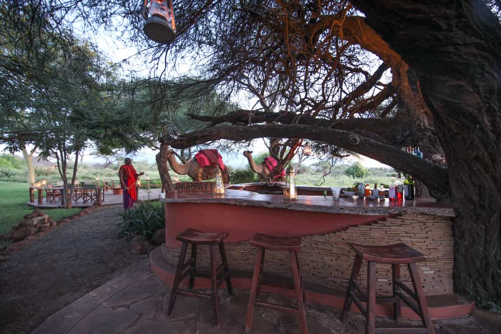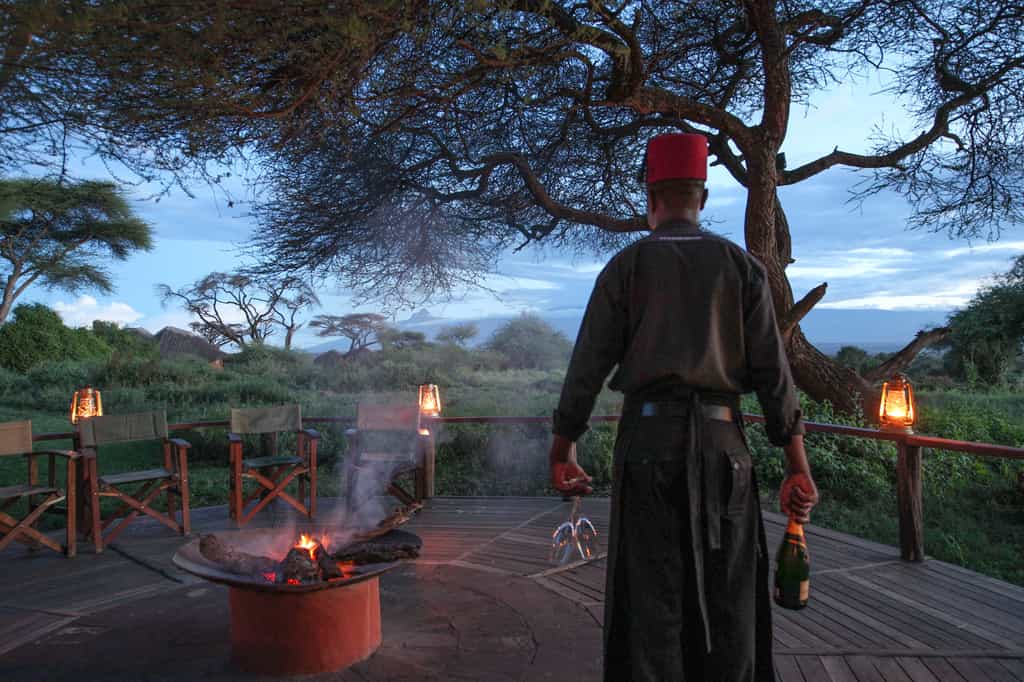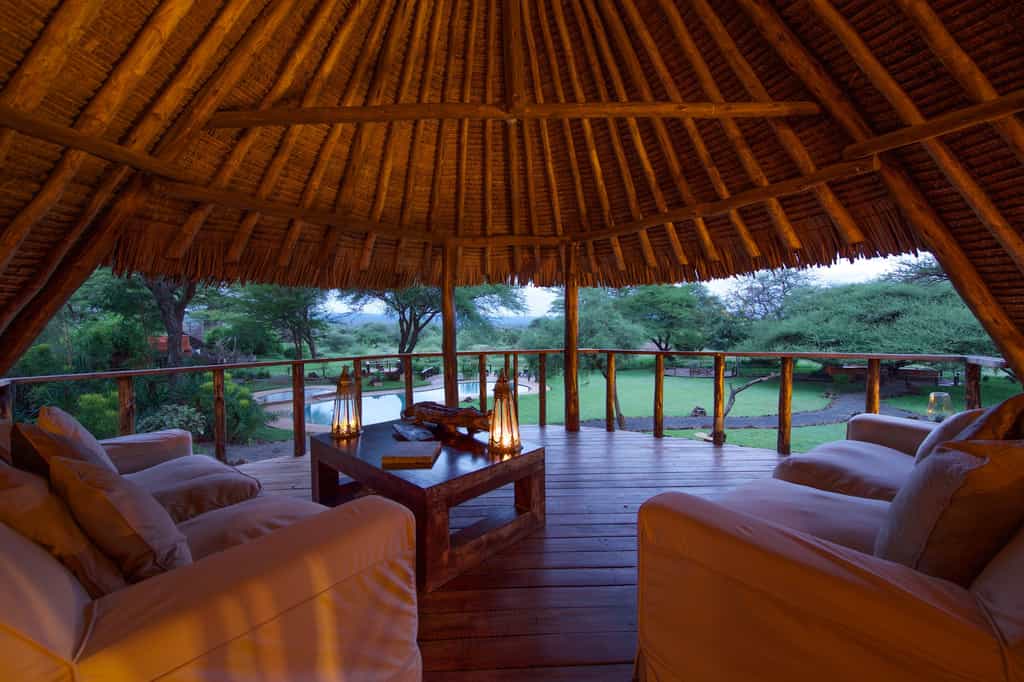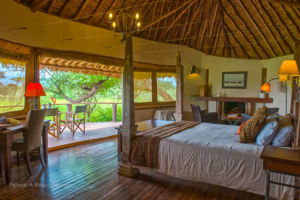 There are 13 spacious traditional Makuti-roofed chalets (more like mini-lodges), designed and spaced to provide maximum privacy. En-suite bathrooms have a bath and shower, the four-poster beds are like a small piece of heaven, and the wooden veranda offers the perfect spot to lounge about and marvel at the stunning views of Mount Kilimanjaro. All units have a fireplace for cold winter nights. Some have a better view of the nearby waterhole and the animals that flock to it.