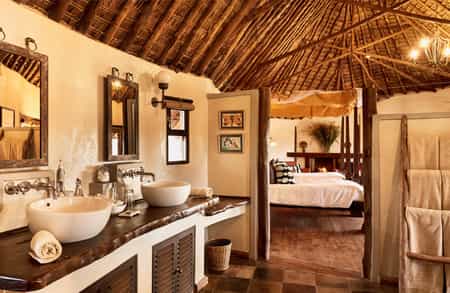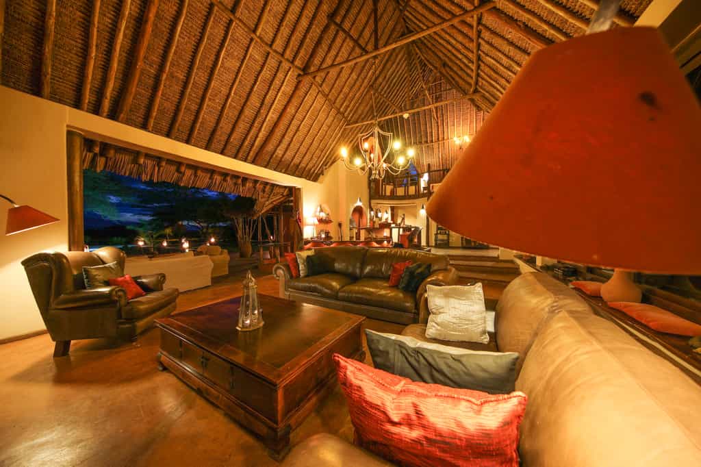 The double-storey lodge has four lounge areas, two bars (one of which is a bush bar built around a tortilis tree) and a library on the mezzanine level. Food is served either in the tree-canopied dining room or in the boma. (You can also request to have yours served in your chalet.) There is a small spa, a heated pool and comfy recliners under the trees at the edge of the lawn - all with good views of the waterhole.