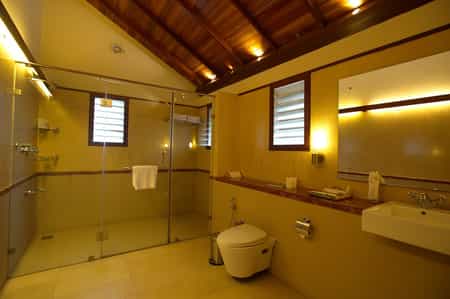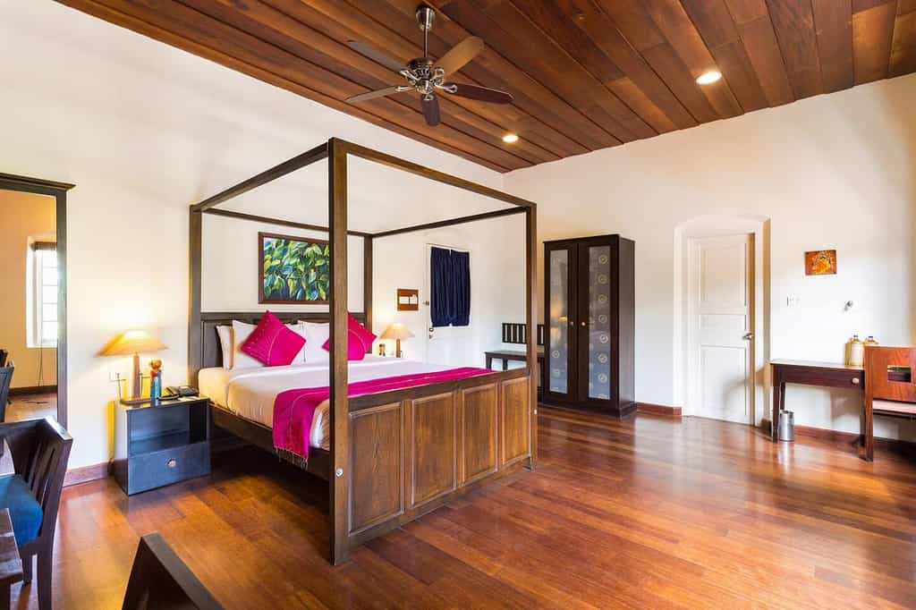 Café du Mahé serves up Keralan and more continental dishes, which you can enjoy in dining room or al fresco on the patio. Lined with polished granite and turquoise Italian tiles, the pool is surrounded by loungers and plenty of greenery. Although the pool is on the small side, most things at the Tea Bungalow are pretty compact. Decorated with model ships and mini paintings, the Travancore Lounge also comes with a home theatre and library.