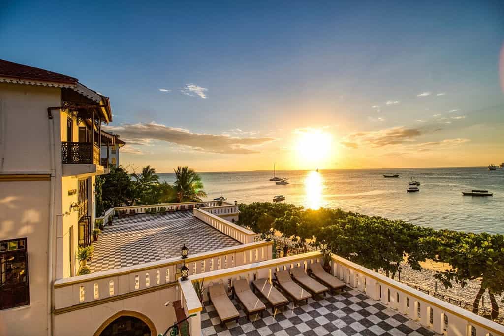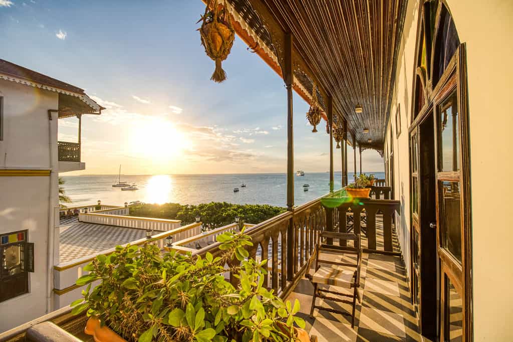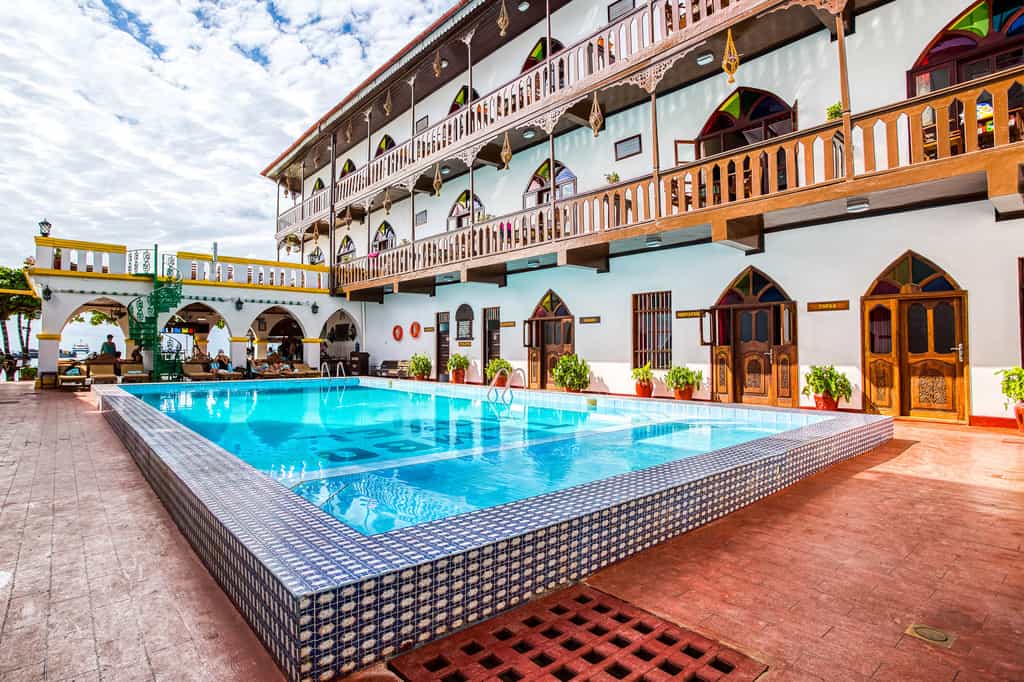 Follow the quirky, checkered flooring to a pretty, Arabian-style courtyard in the centre of the hotel. Hidden away from the busy streets of downtown Stone Town, it's a lovely, calming place with traditional Swahili furnishings and plenty of hanging chairs for relaxing. There's also a swimming pool for cooling off in. Bahari Restaurant overlooks the sea, and serves a variety of local delicacies and international favourites (but there's no alcohol). For something more romantic, head up to the roof terrace for a private dinner a deux under the twinkling stars.