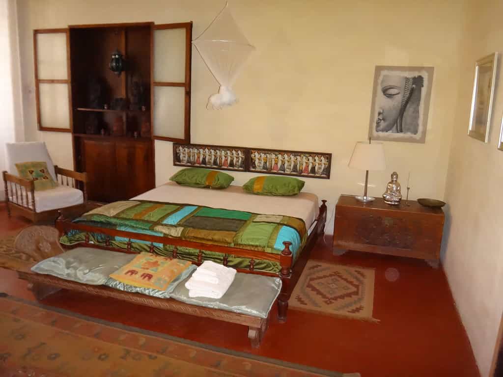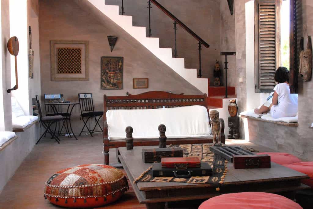 An intricately carved huge wooden door opens into an inner courtyard with stairs rising to the main lounge, with its comfortable couches and intriguing collection of antique furniture scattered across the polished stone floors. At one end is an enormous dining table that's a lovely spot for breakfast. A small patio with a hammock offers a quiet spot to relax and catch the breeze, and there’s a contrastingly modern rooftop terrace overlooking the sea.