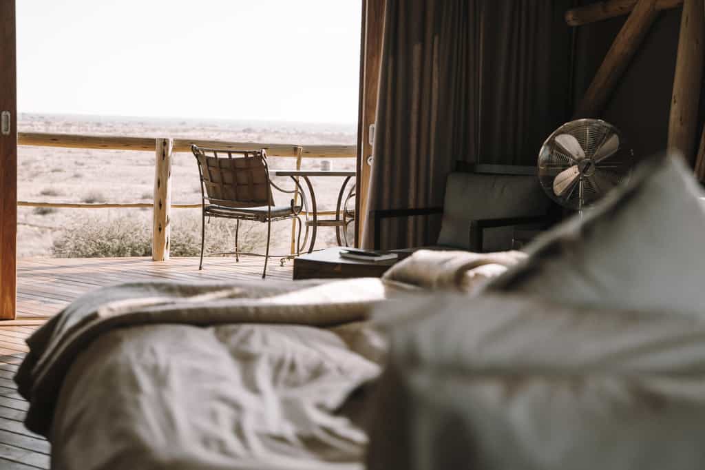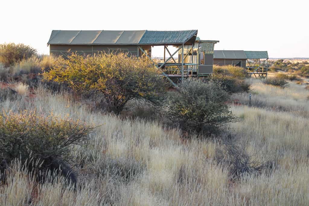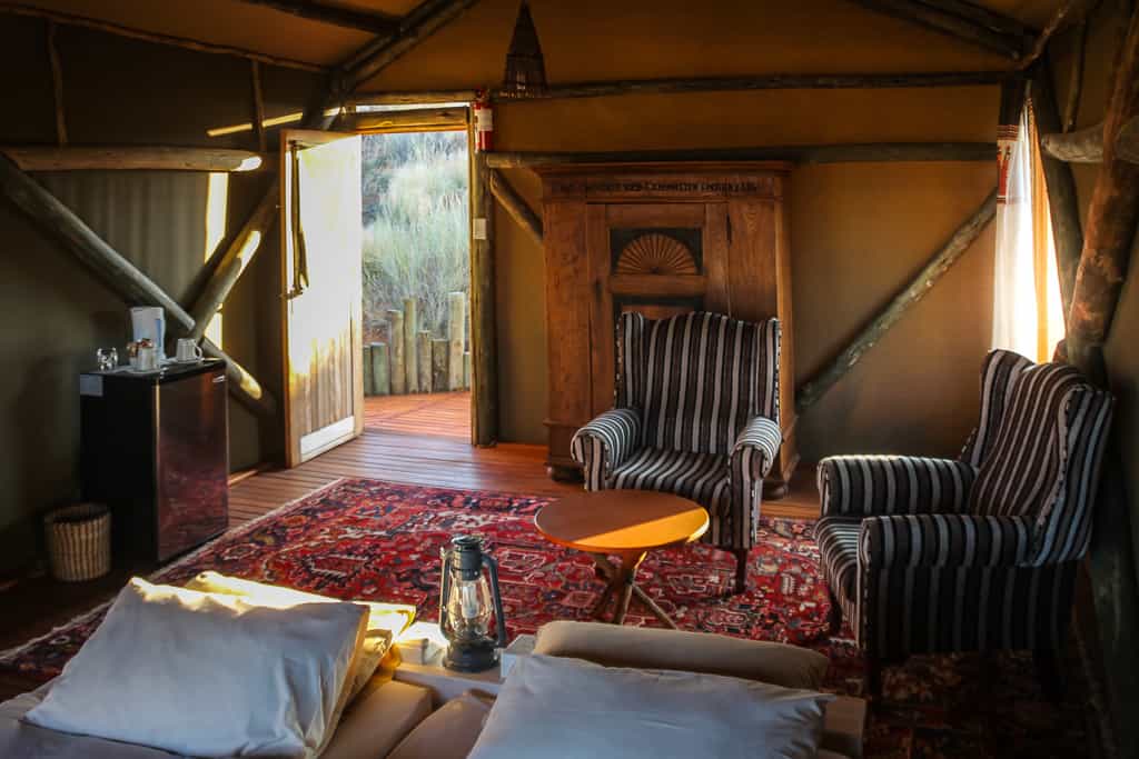 There are two markedly different styles of accommodation here, though they maintain the same price point. All six rooms are perched on a dune overlooking the vast desert. Each are appointed with a mini fridge and its own view-exploiting bathroom and shower, accessed by a few meters of boardwalk - all in the name of making the most of every experience. The three tent houses are comfortably and tastefully furnished with large, high-backed lounge chairs and a colorful rug. They enjoy more interior space than the three cabin tents which are a bit tight inside but possess an ample outdoor veranda.