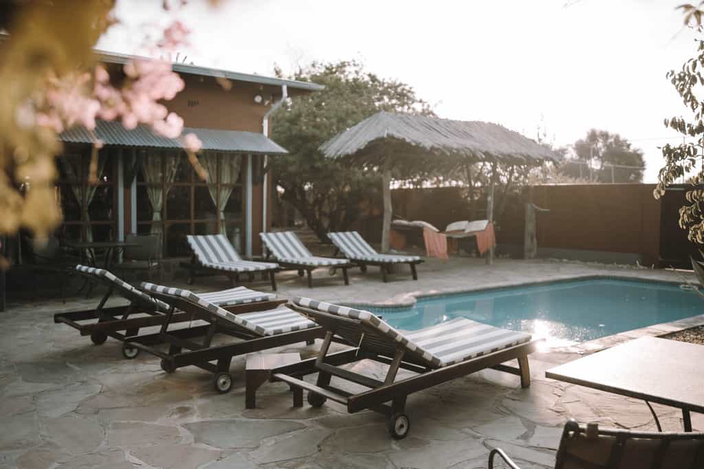The Altes Farmhaus is the lodge's simple and tastefully decorated reception, restaurant and common area. It's located three kilometers from the actual accommodation. Here you'll be greeted with a cold welcome drink upon arrival and directed to your tent. Outside you'll find a lovely shade-dappled patio and pool area complete with under-cover hammock. Meals are served from the farmhouse - breakfasts usually in the garden and dinners inside by candlelight. Unwind here after a long day's drive or catch up with the world with free wi-fi.