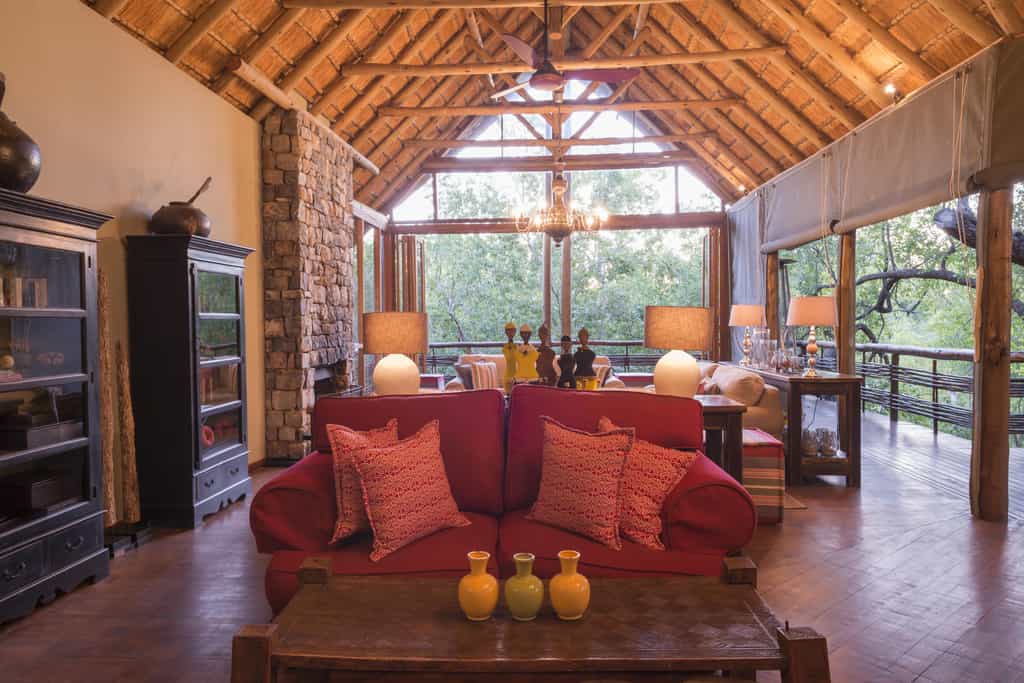With a distinctly African-Asian safari style, the lodge is a concoction of natural stone, wood and fibres. The main area is located between the Marico River and its tributary and the large open plan lounge, dining area and reception area is full of comfy chairs, sofas and interesting artefacts. There is a traditional 'lapa' within the natural riverine forest, and a swimming pool that boasts panoramic views of the gully and the river to the north.