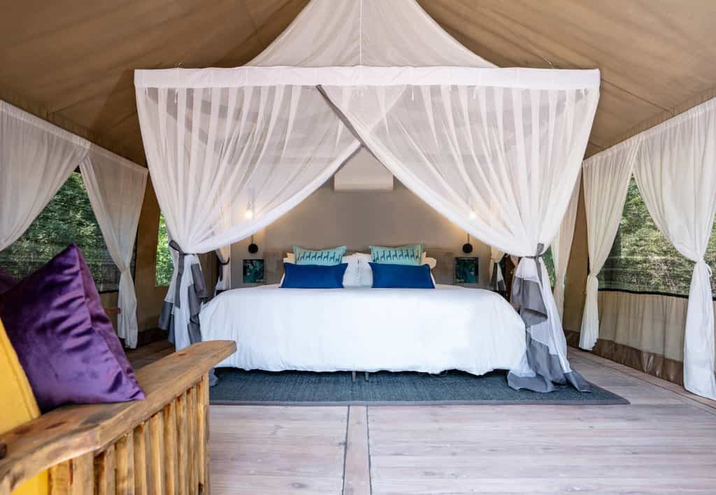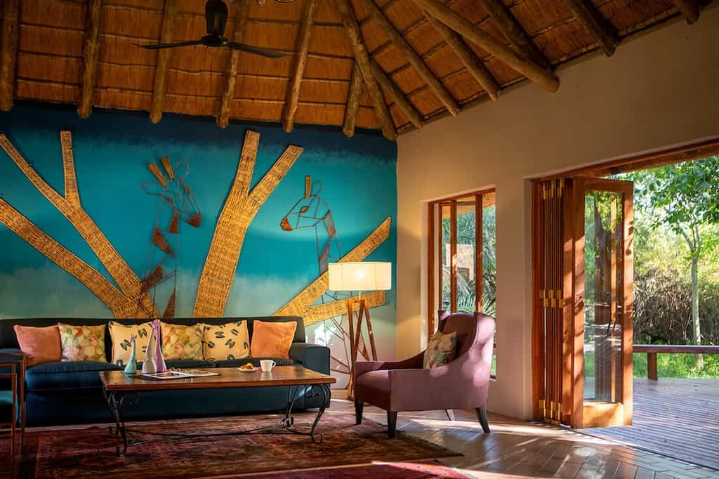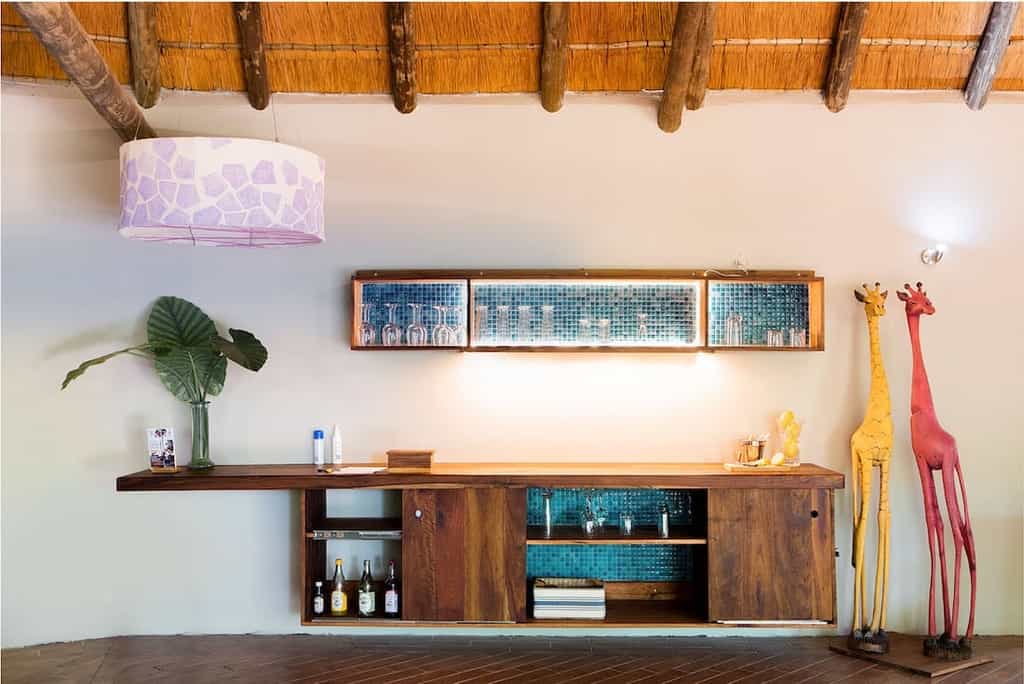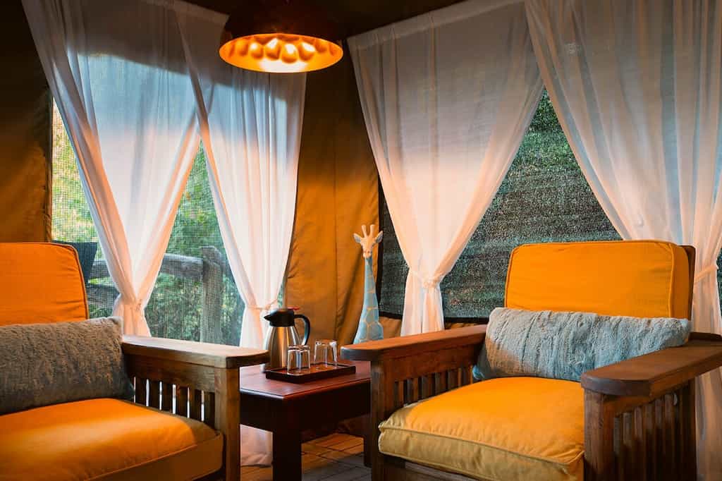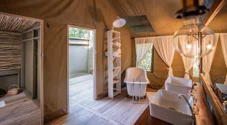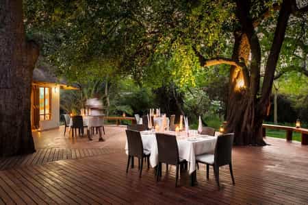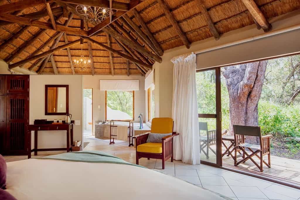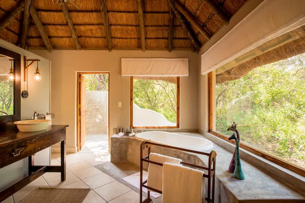 Thamo Telele has nine safari-style tents on raised wooden platforms. The twin or double beds are shrouded in netting and dotted with scatter cushions (with a giraffe motif, of course), and just next to them is a small sitting area. Bathrooms are large and luxe with clawfoot tubs, dual vanities and outdoor showers. There are also two thatched honeymoon chalets, both boasting King-sized beds and sunken baths. All accommodation is air-conditioned and the forest provides an added sense of privacy.