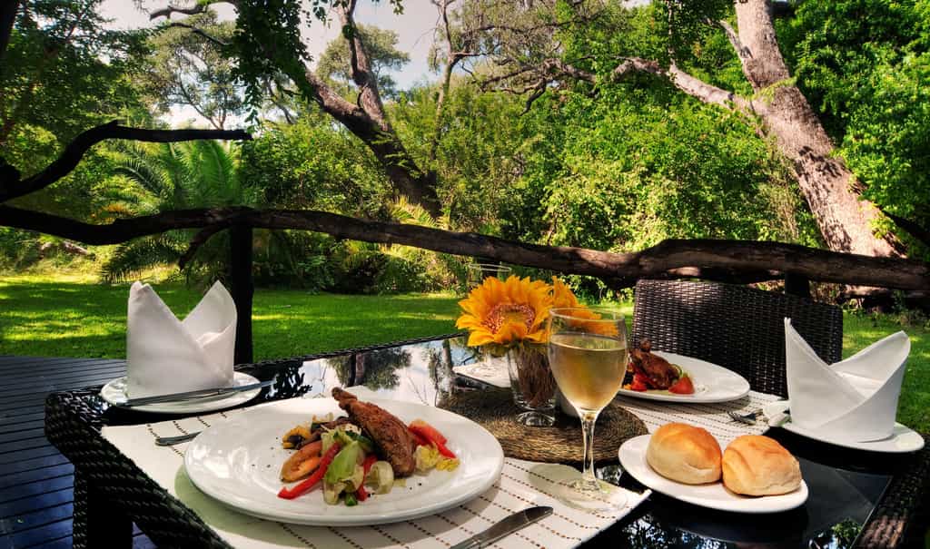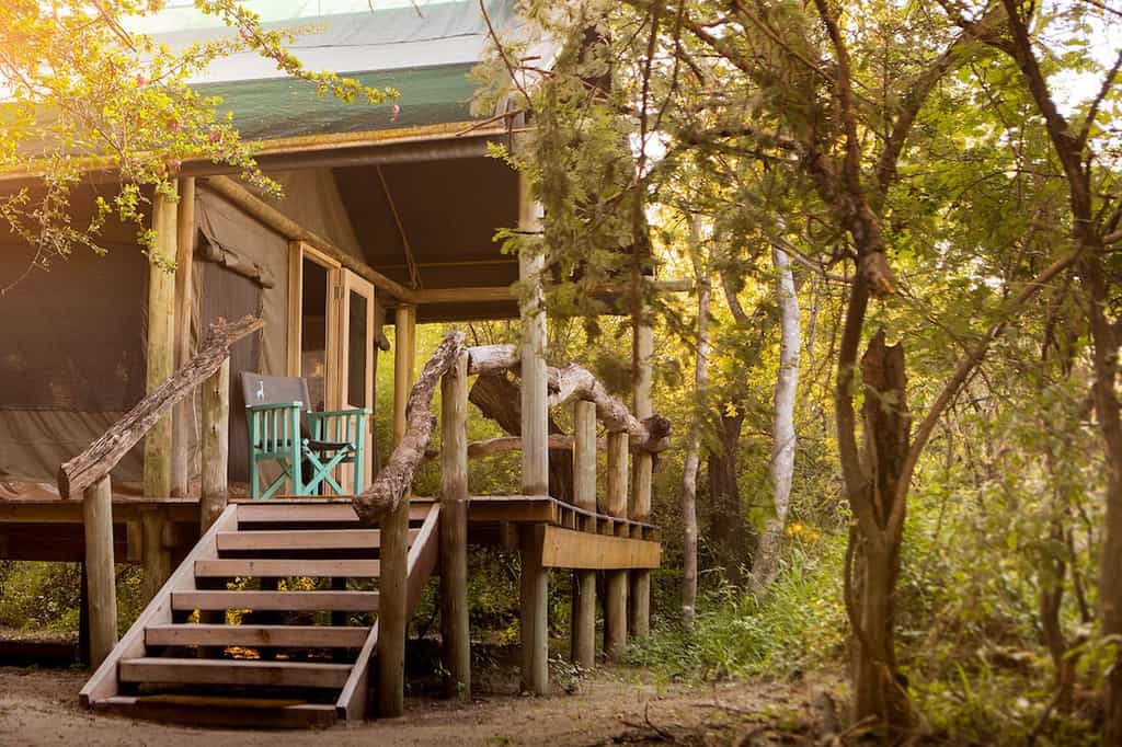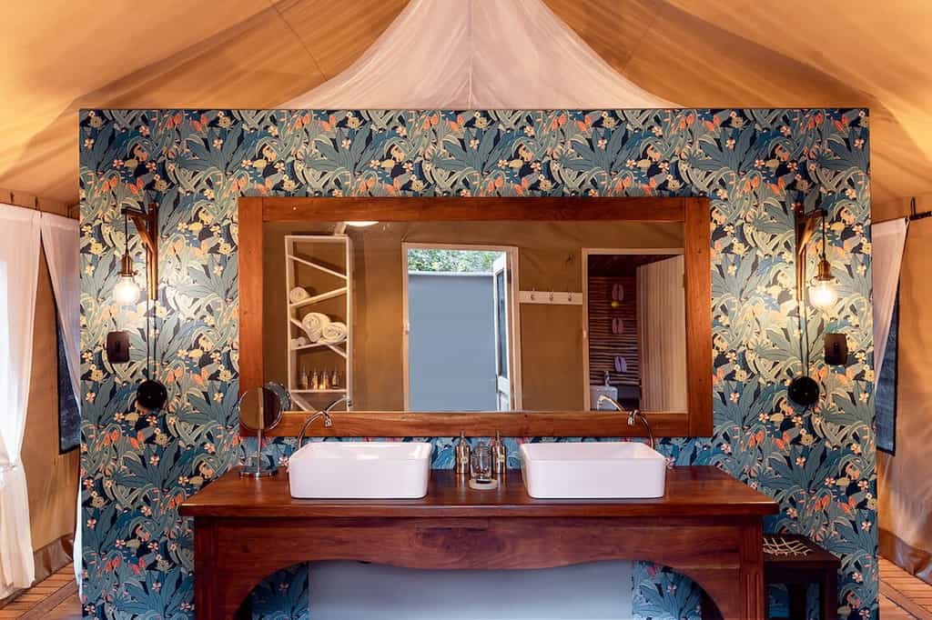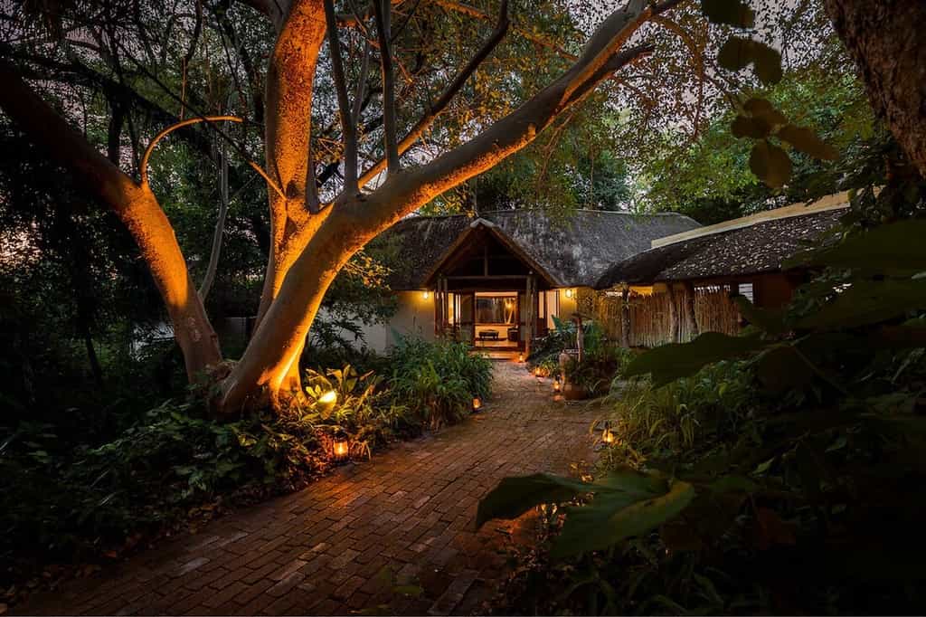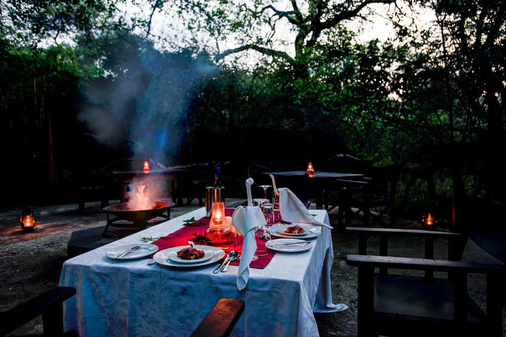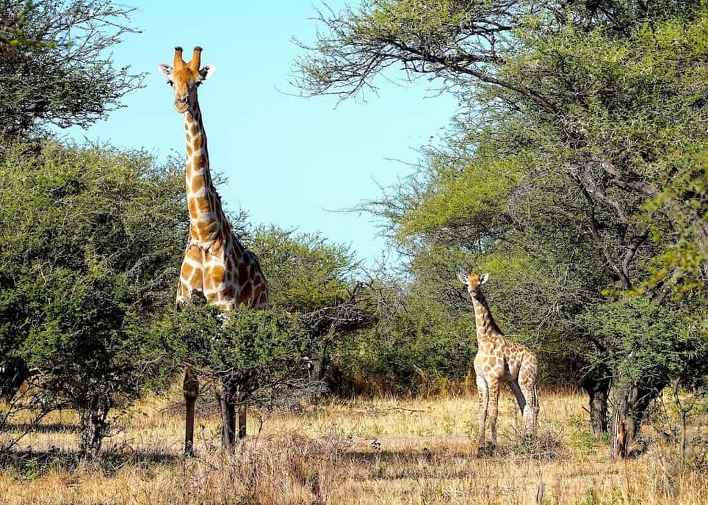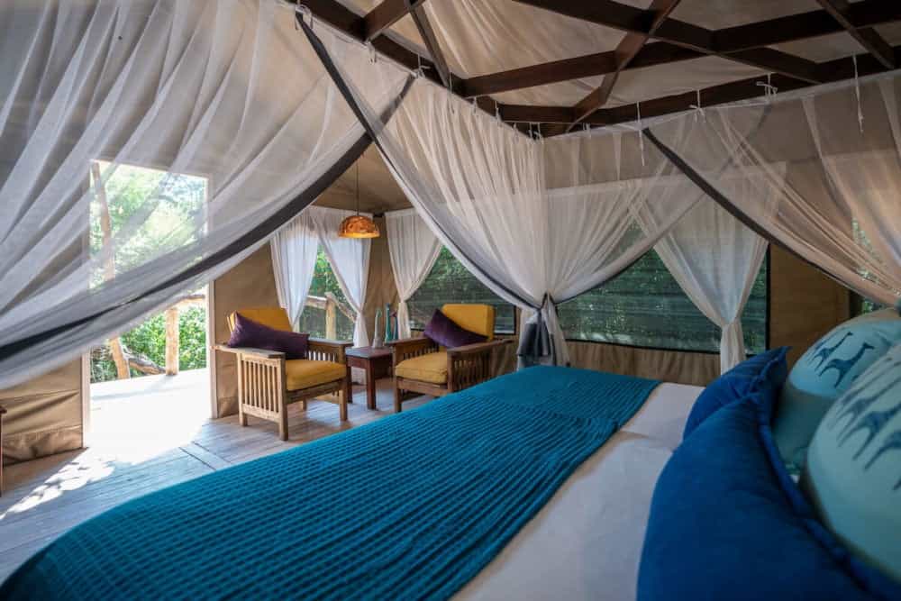 Thamo Telele has nine safari-style tents on raised wooden platforms. The twin or double beds are shrouded in netting and dotted with scatter cushions (with a giraffe motif, of course), and just next to them is a small sitting area. Bathrooms are large and luxe with clawfoot tubs, dual vanities and outdoor showers. There are also two thatched honeymoon chalets, both boasting King-sized beds and sunken baths. All accommodation is air-conditioned and the forest provides an added sense of privacy.