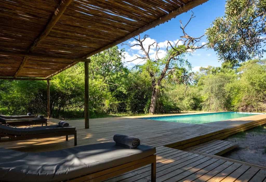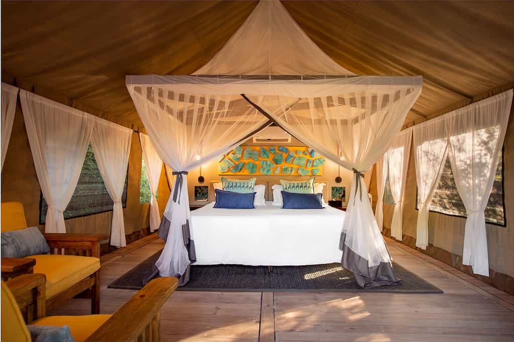 Sitting amongst shady leadwood and acacia trees, the main lodge is decorated in a homely style with cushy couches to flop into, lots of locally-made pottery dotted around, and artwork featuring their beloved giraffe. In your down time, grab a drink from the bar or enjoy a dip in the lap pool. Large windows reveal a peaceful view of the gardens and, weather permitting, all meals will be served on the veranda. Should you fancy it, book a private dinner round the firepit.
