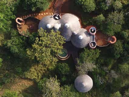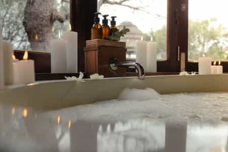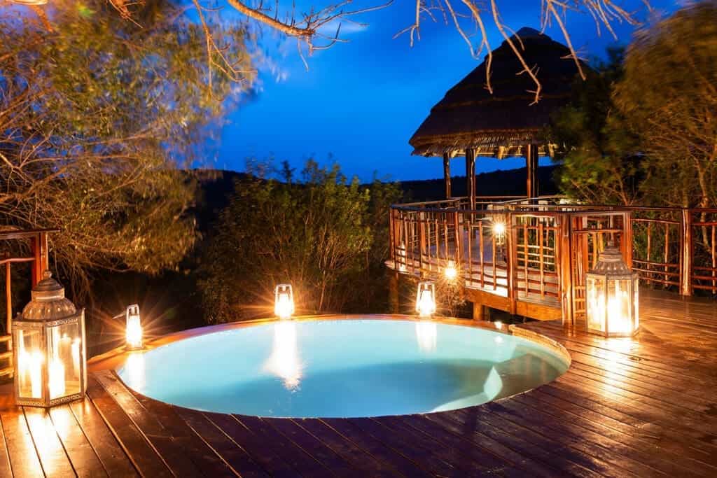 Each suite consists of three distinctively shaped thatched roof rondavels but that is where the resemblance to a traditional Zulu homestead ends. The 220m² homes are the height of luxury with huge bedrooms and plush lounges separated by a double fireplace and opulent indoor and outdoor bathrooms. Thanda Safari Lodge’s suites have their very own circular plunge pool, outdoor private boma and elevated sala circular deck with panoramic views of the surrounding game reserve. Sheer bliss!