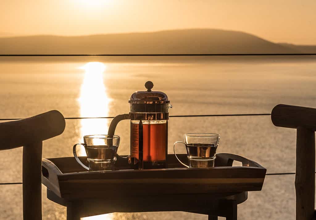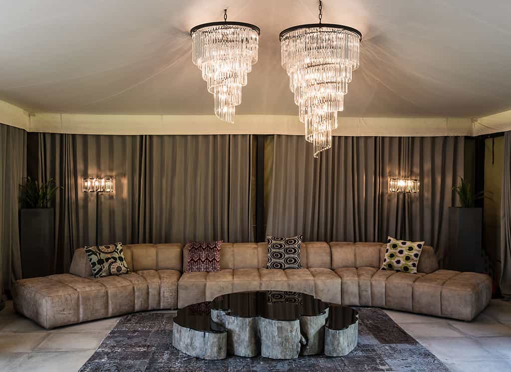 The main area consists of a broad, commodious tent, which encompasses several intimate seating areas, plus a long bar where both espresso and cocktails are served. The décor is elegant: staggered chandeliers, heavy drapery surrounding the tent sides, handsome fabrics on cushioned chases and high-backed leather chairs. A dining room is set with long tables for convivial diners or intimate tables for two. Its top feature by far is its view, sweeping and expansive, over the lake which seems to shift according to the time of day.