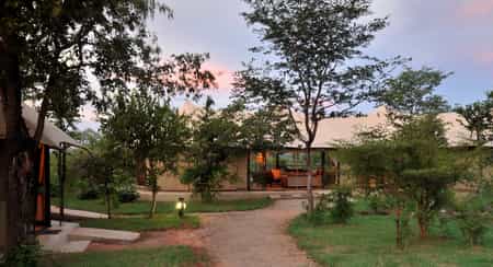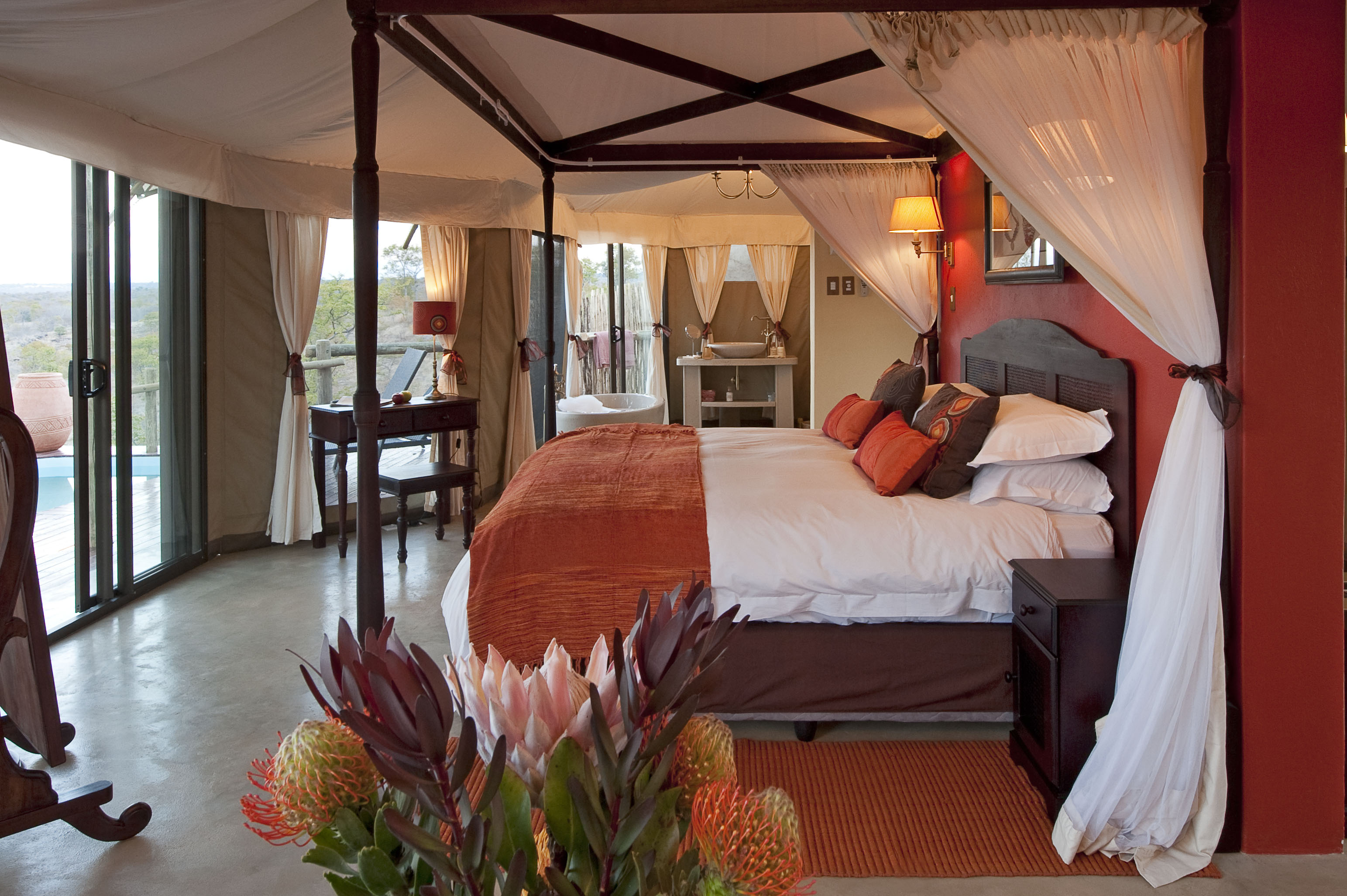 The communal spaces are set beneath a draped ceiling, with solid floors, a raised wooden deck and wrap-around glass doors. Relax in the lounge on comfortable leather couches and wicker chairs set beneath ceiling fans and chandeliers. The dining space has three large wooden tables with dark high-back chairs. There is also a simple bar and library set-up. Outside on the deck are clusters of seating and a swimming pool with recliners. Enjoy breathtaking views from every corner of the camp.