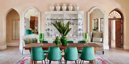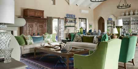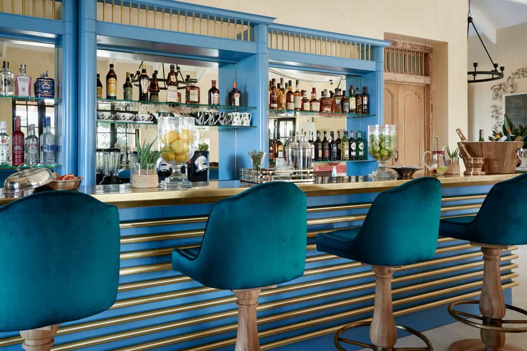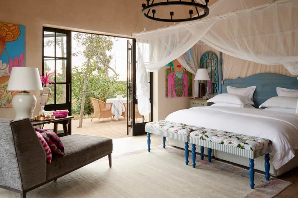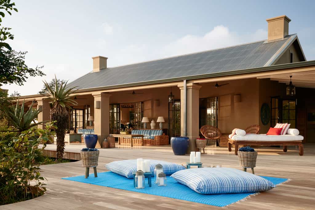 The central farmhouse is a U-shaped structure reminiscent of converted stables, complete with brushed clay walls and a tin roof. Set around an interior courtyard, it's a flowing space with plenty of windows, and interiors that are furnished in shades of rich royal blue and indigo. The wraparound veranda is ideal for gazing at the bush and the nearby waterhole,. There's a double spa-treatment room, a small gym and a fire pit where guests gather in the evenings.