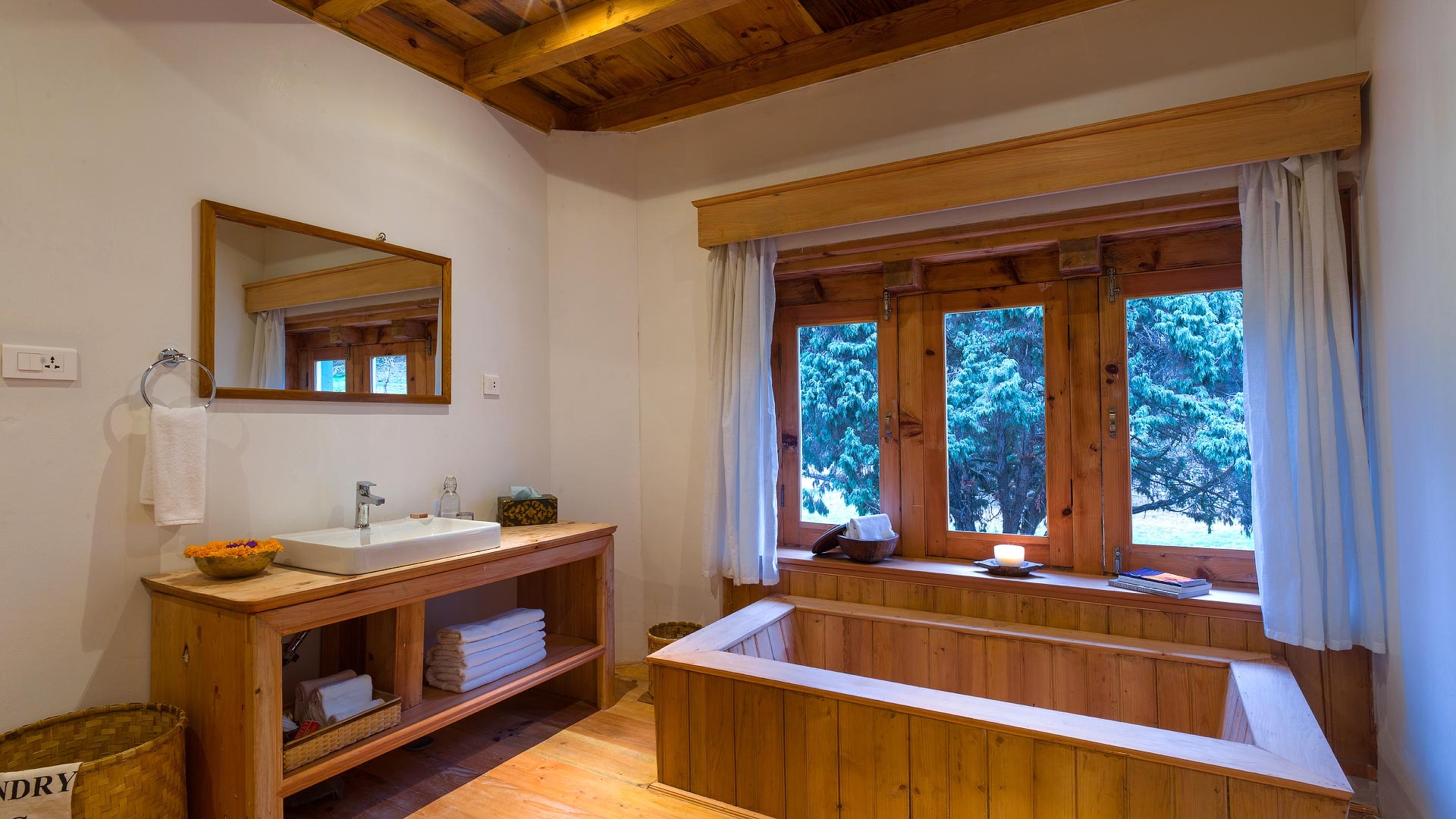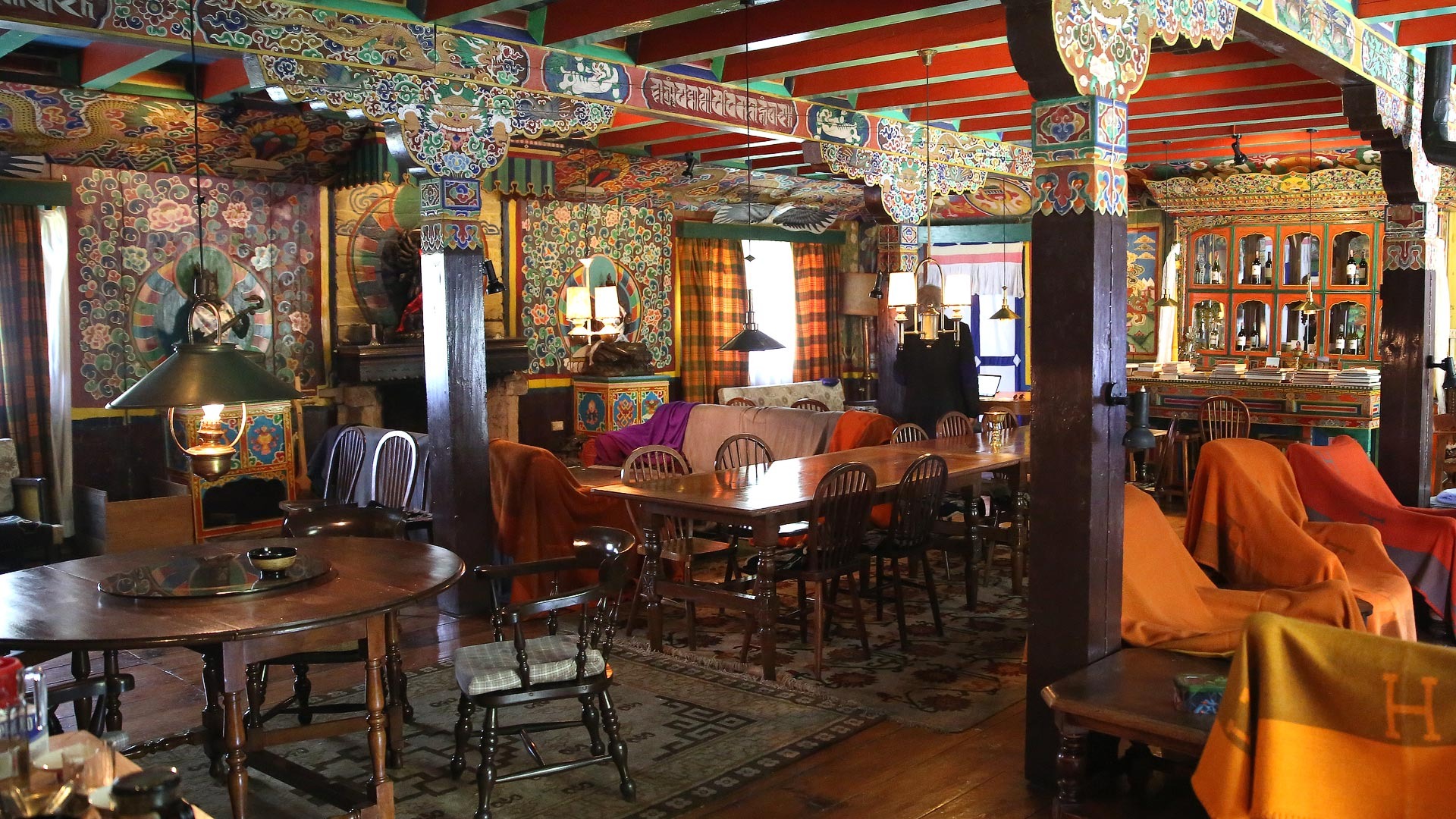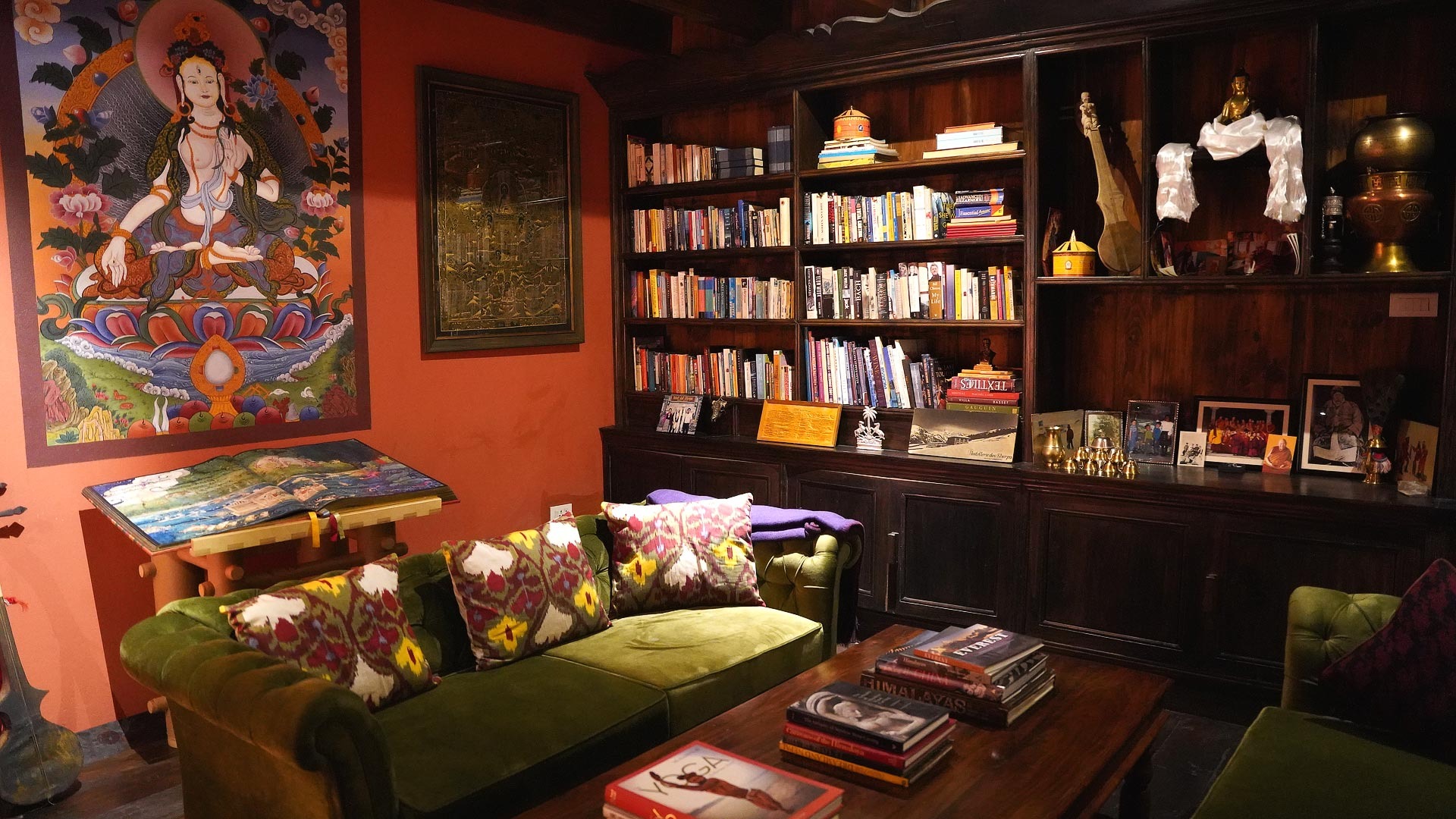 Walls blaze with hand-painted Thangka murals – Buddhist deities, polka-dot dragons, blue-faced demons peering from shadows – by Sherpa master Khapa Rinzi. The communal dining table sits by a roaring fire where a private chef serves organic produce from the garden: momos, dal bhat, thukpa, plus foraged morels and wild fern. A small library holds deep leather chairs and mountaineering history and to unwind, there's a candlelit spa, sauna and resident yoga master – daily massages are standard.