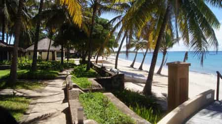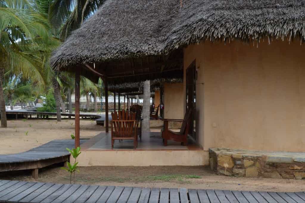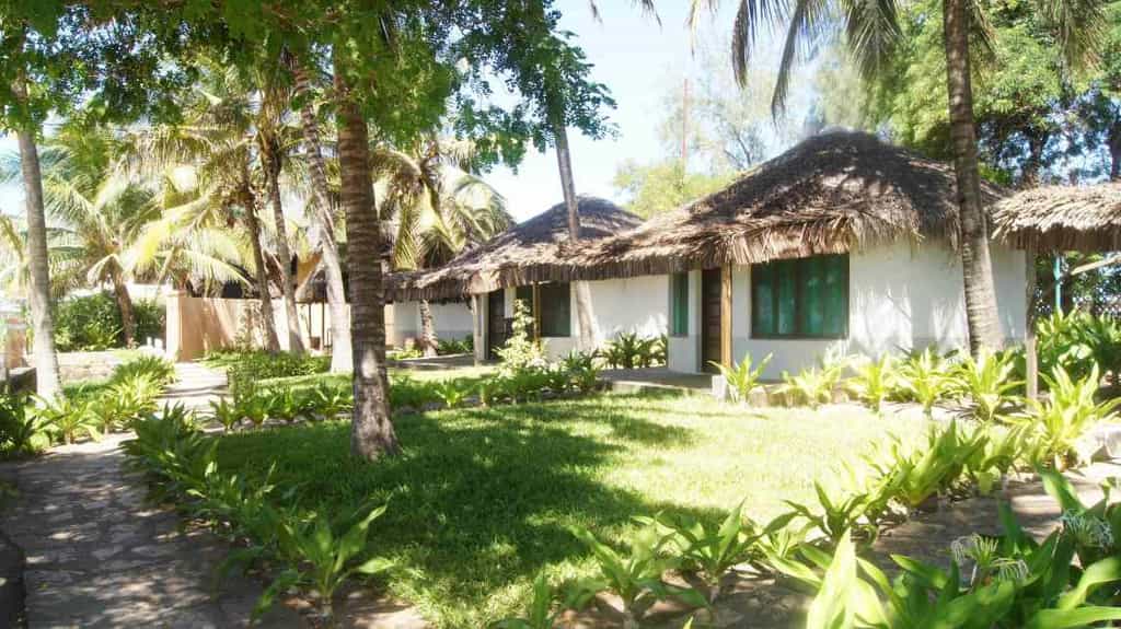 Twenty-one thatched bungalows sit in two rows under coconut palms, just back from the beach. (The front row is massively preferable to the one behind it, which backs on to Pemba's main coastal road.) A wooden walkway links the units to the covered, furnished veranda and pool. Each hut has two bedrooms with double or twin beds and a small lounge with air-conditioning, a TV and bar fridge. There is one bathroom per hut, with a shower and a loo.