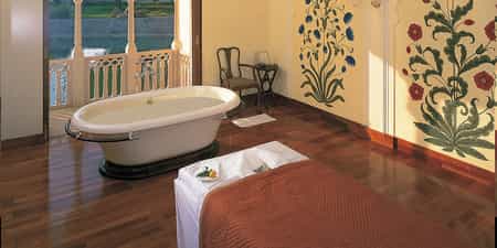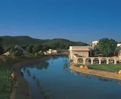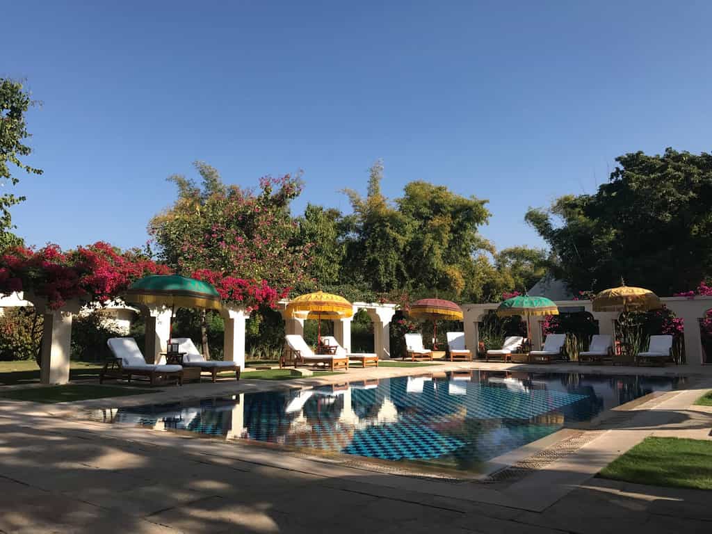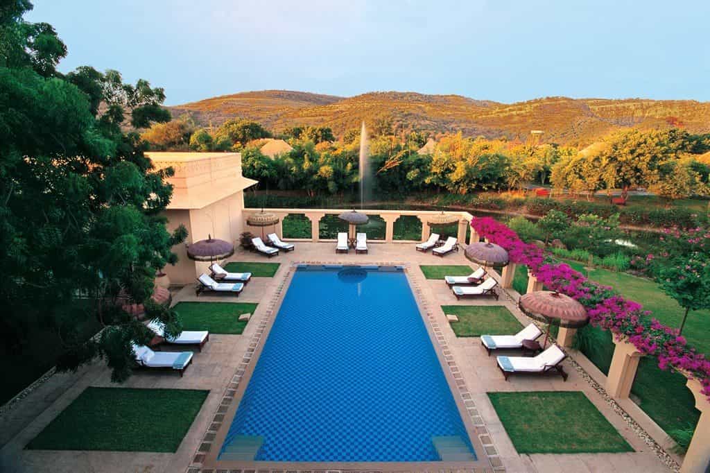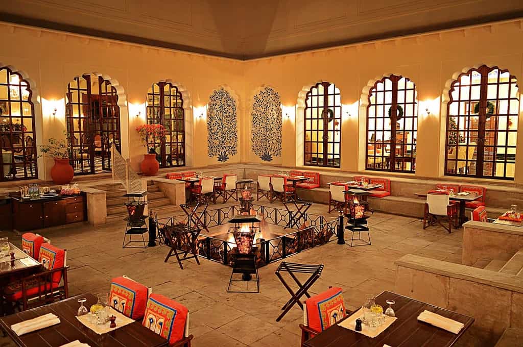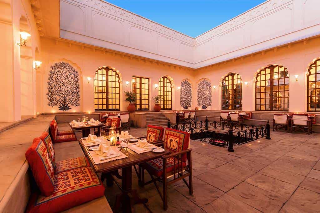 Enjoy authentic Rajasthani cuisine and more international fare at The Dining Room with its painted walls and high chandeliers. Drinks at the bar are a cosy affair, surrounded by tigress oil paintings and walls of well-read books. Enter the spa past flower-filled water features where you can partake in a range of treatments overlooking the lily pond - plus yoga sessions on the pavilion. In a sunny courtyard, enjoy a soak in the pool complete with colourful, tasseled umbrellas.