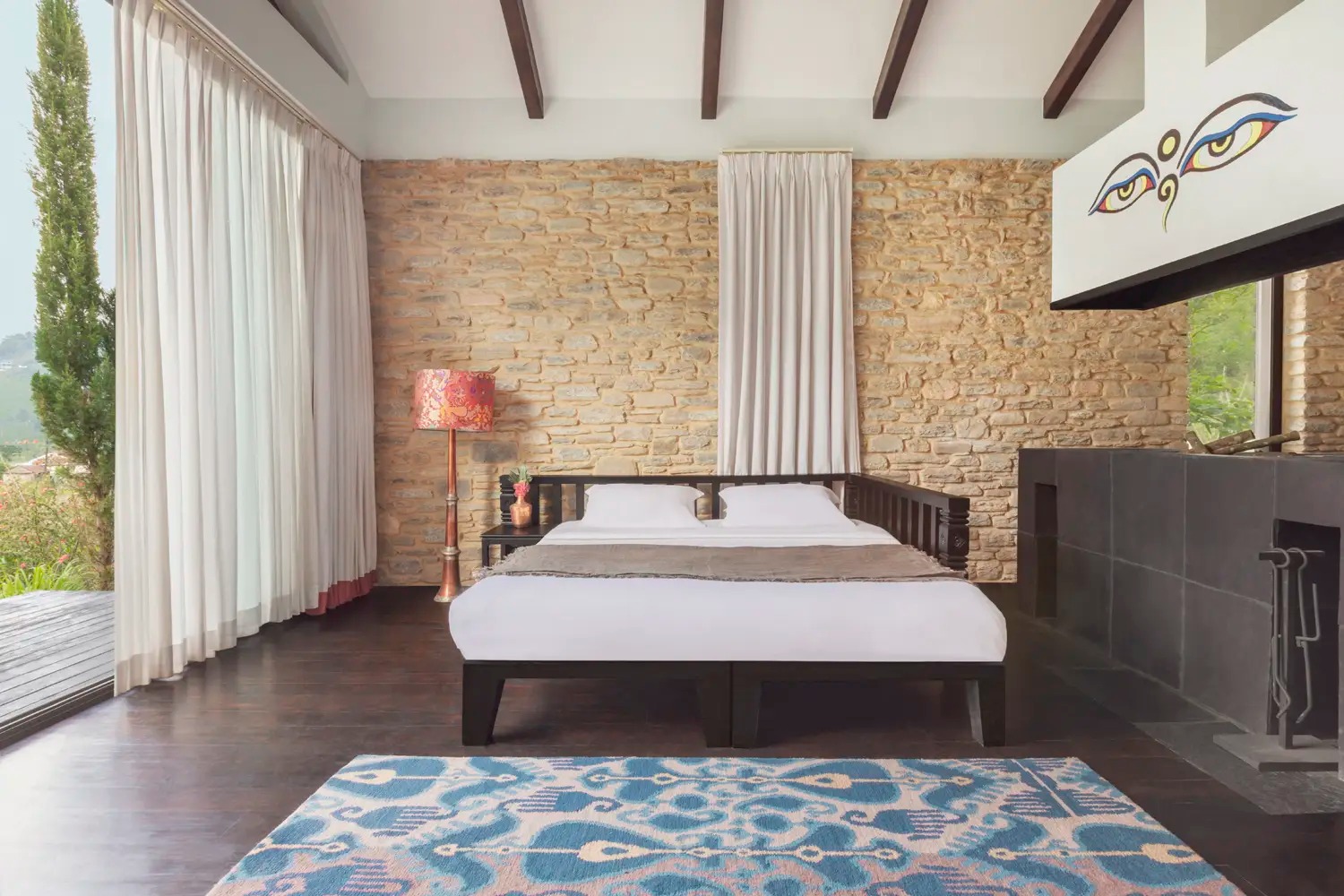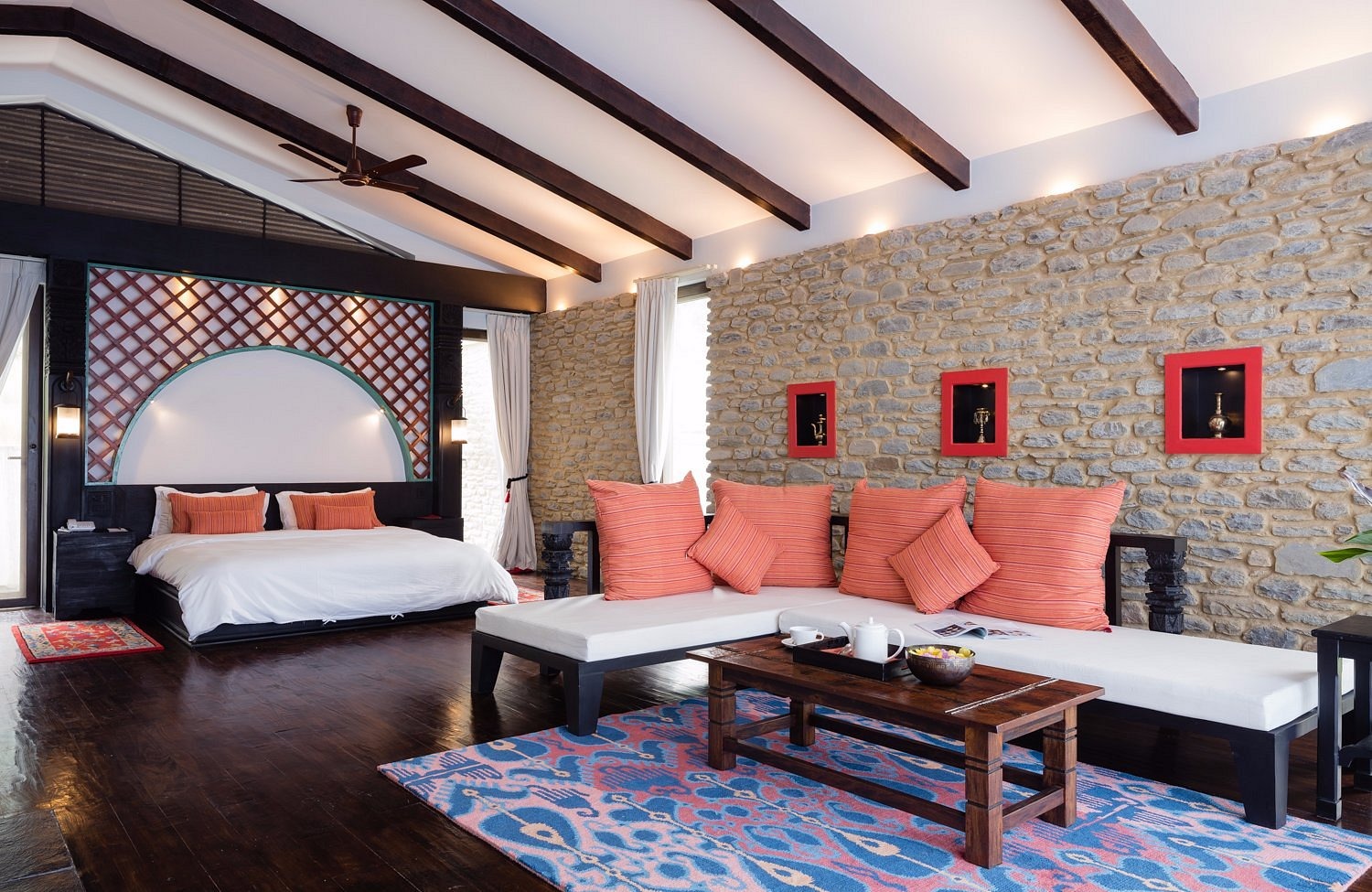 The Farm has 14 villas ranging from cosy Classics to the two-bedroom Chalet, all with stone fireplaces, private terraces and views across the paddies to snow-capped peaks. The Jacuzzi tubs in the bathrooms are also very lovely. Lake View's eight tented villas feel more like a luxury African safari camp – floor-to-ceiling windows, retractable glass doors, outdoor rain showers and handcrafted furniture, but the Royal tent is the showstopper: four-poster bed, freestanding tub and a terrace that seems to hover above Phewa Lake. There are no televisions here by design; you're meant to be watching the mountains.