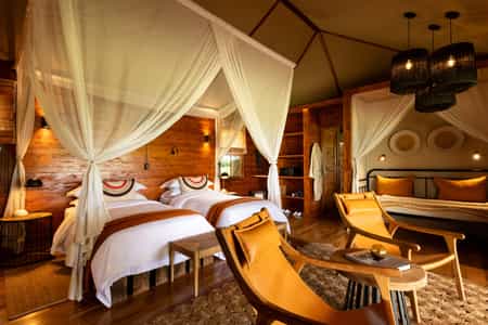 Situated in the northern Serengeti, close to the Mara River, The Retreats at Sayari Camp offer a luxurious base from which to experience the world-famous river crossings, where migrating wildebeest brave the crocodile-infested waters. The two Retreats at Sayari Camp are identical in their layout, with a shared swimming pool and additional lounge area situated between them for the use of Retreat guests.