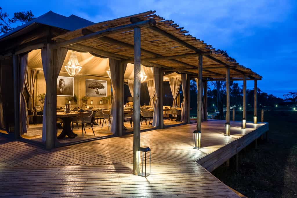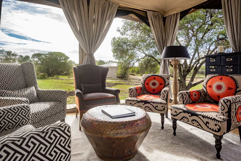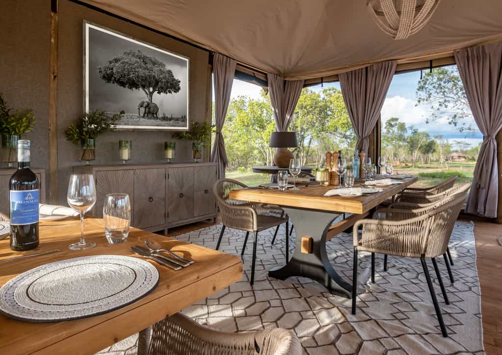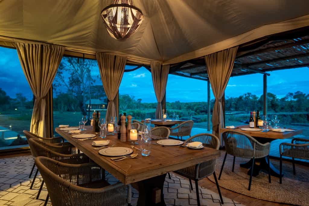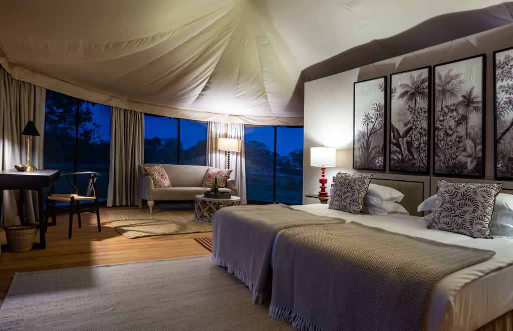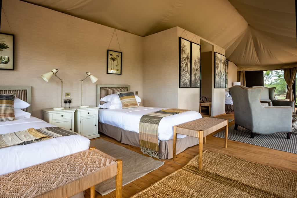 Six double tents and two family suites line the riverbank, each positioned for maximum privacy and wildlife viewing. Elegant canvas and timber suites house king-size beds, writing desks, and both indoor and outdoor showers – because nothing beats washing off safari dust under the stars. Private decks with daybeds become your personal 'hide', overlooking watering holes where elephants drink at dusk. The interiors are simply lovely with quality linens, local artwork, and thoughtful lighting that creates atmosphere without disturbing the wildlife. And family tents feature separate sleeping areas for children.