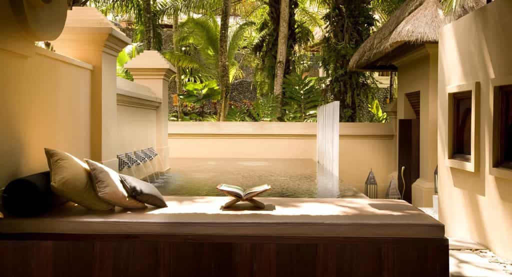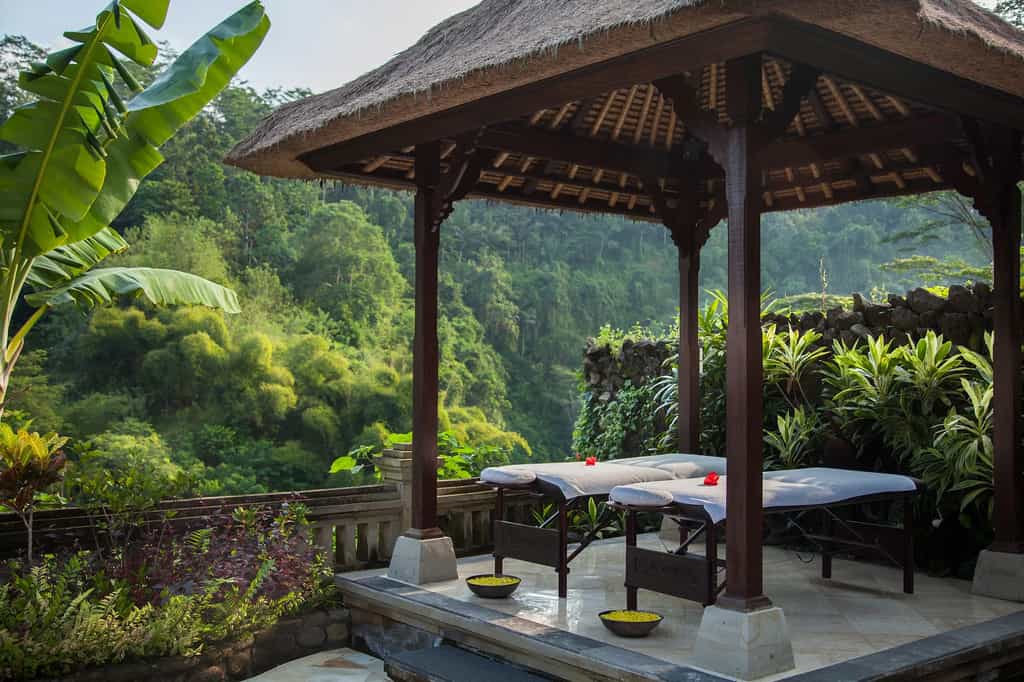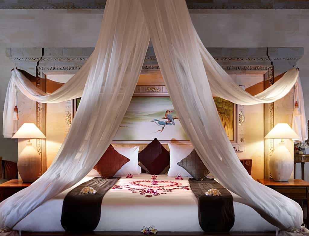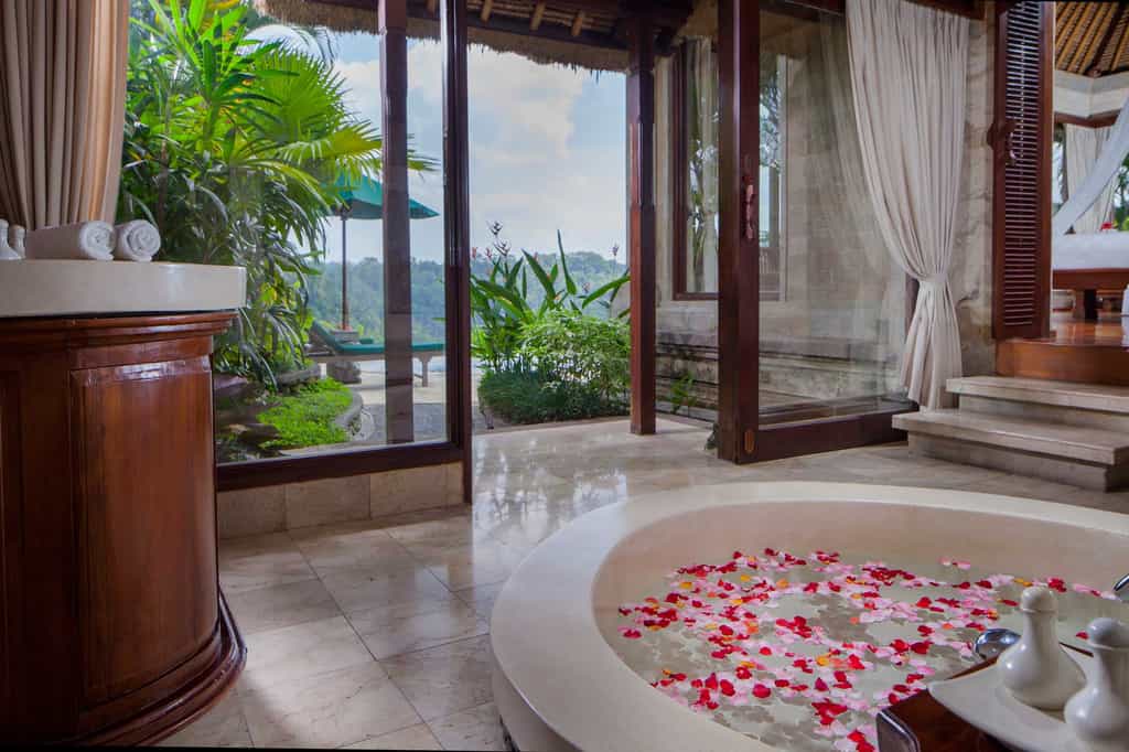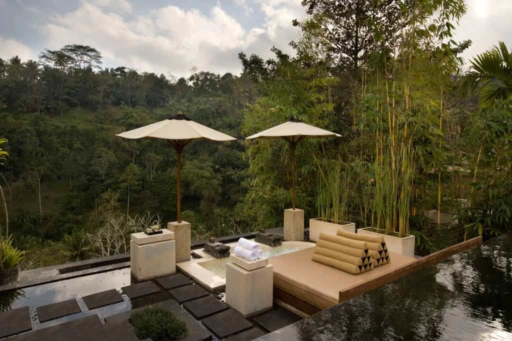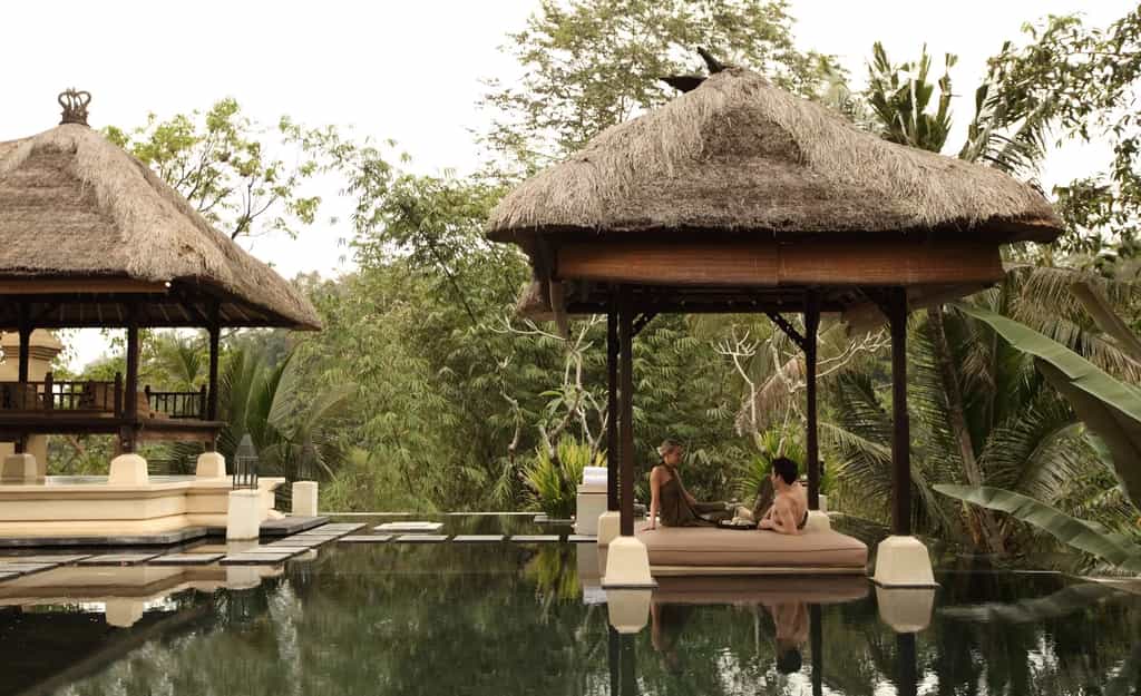 Each villa is a haven of opulence, featuring four-poster beds, hand-carved furniture, and sprawling private terraces. The real showstopper? Your own infinity pool, where you can float lazily while watching the jungle canopy sway in the breeze. The bathrooms are equally indulgent, with sunken tubs that offer views of the valley. Every detail, from the artwork to the bed linens, exudes luxury, yet retains an authentic Balinese charm.