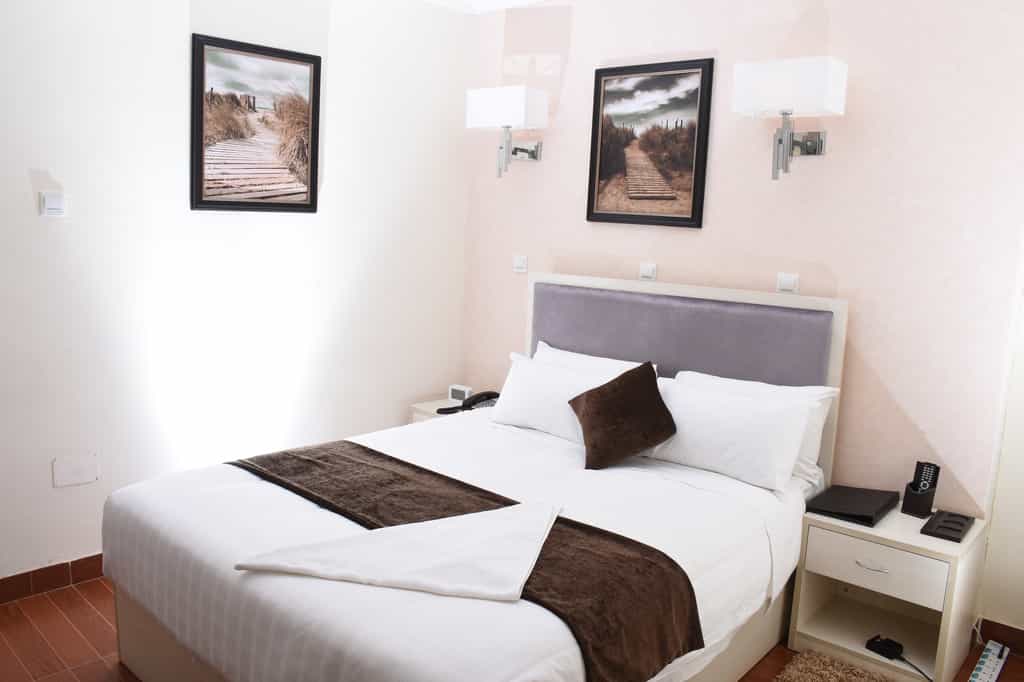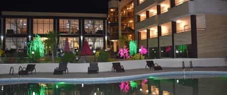 The three-storey hotel centres around a grassy courtyard that invites you to laze on a lounge chair beneath the poolside arcade or sip espresso in the sun. At night, it's illuminated with neon lights. This is a B&B establishment, and the breakfasts are plentiful, with à la carte offerings available all day. There's a gym and a spa with a good range of services, from massage therapies to beauty treatments, and free wi-fi.