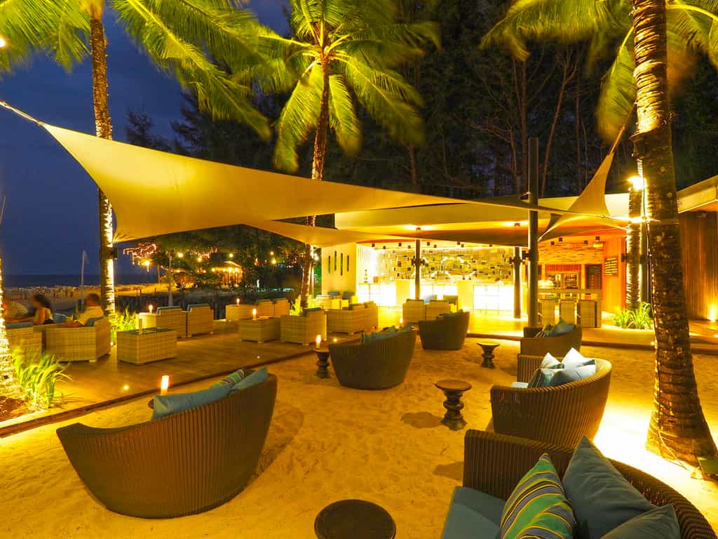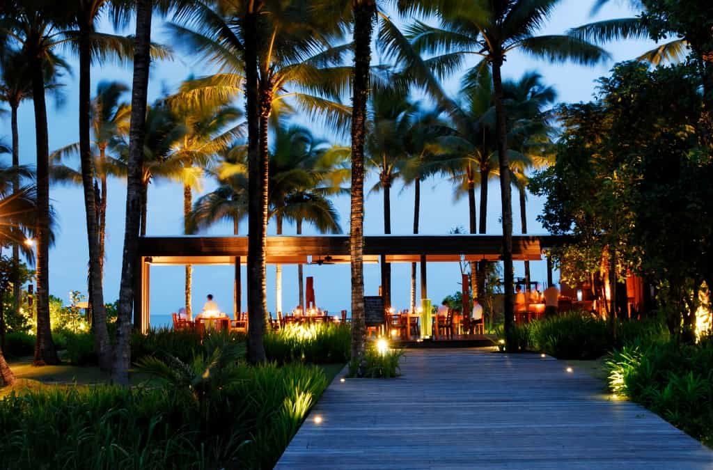 The pool is a lovely size with a sunken jacuzzi, three over-water pavilions and wooden walkways leading to the spa, which seems to float upon an estuary. Using essential oils from across Thailand, the centuries-old treatments are a balm for the soul. Down by the sand, the Beach Bar is a blend of fruit cocktails, seafood baskets and bean bags under canvas. The Edge is in a timber pavilion and serves regional Asian dishes and beneath an ancient tree, the Ficus restaurant is light and bright with a varied menu (and wine list!).
